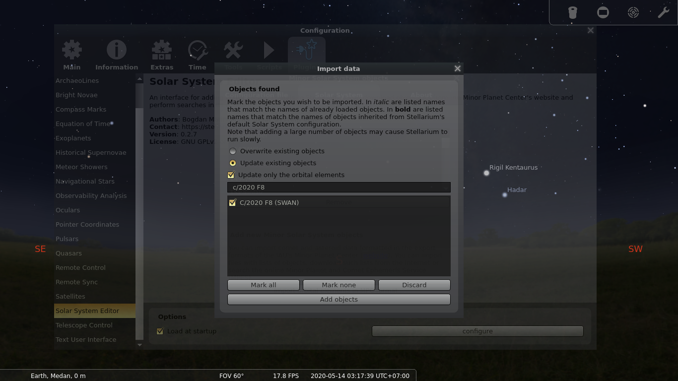 Update existing objects. ketik nama comet yang ingin anda tambahkan lalu centang. atau centang semua nama komet yang muncul. selanjutnya klik "add objects"