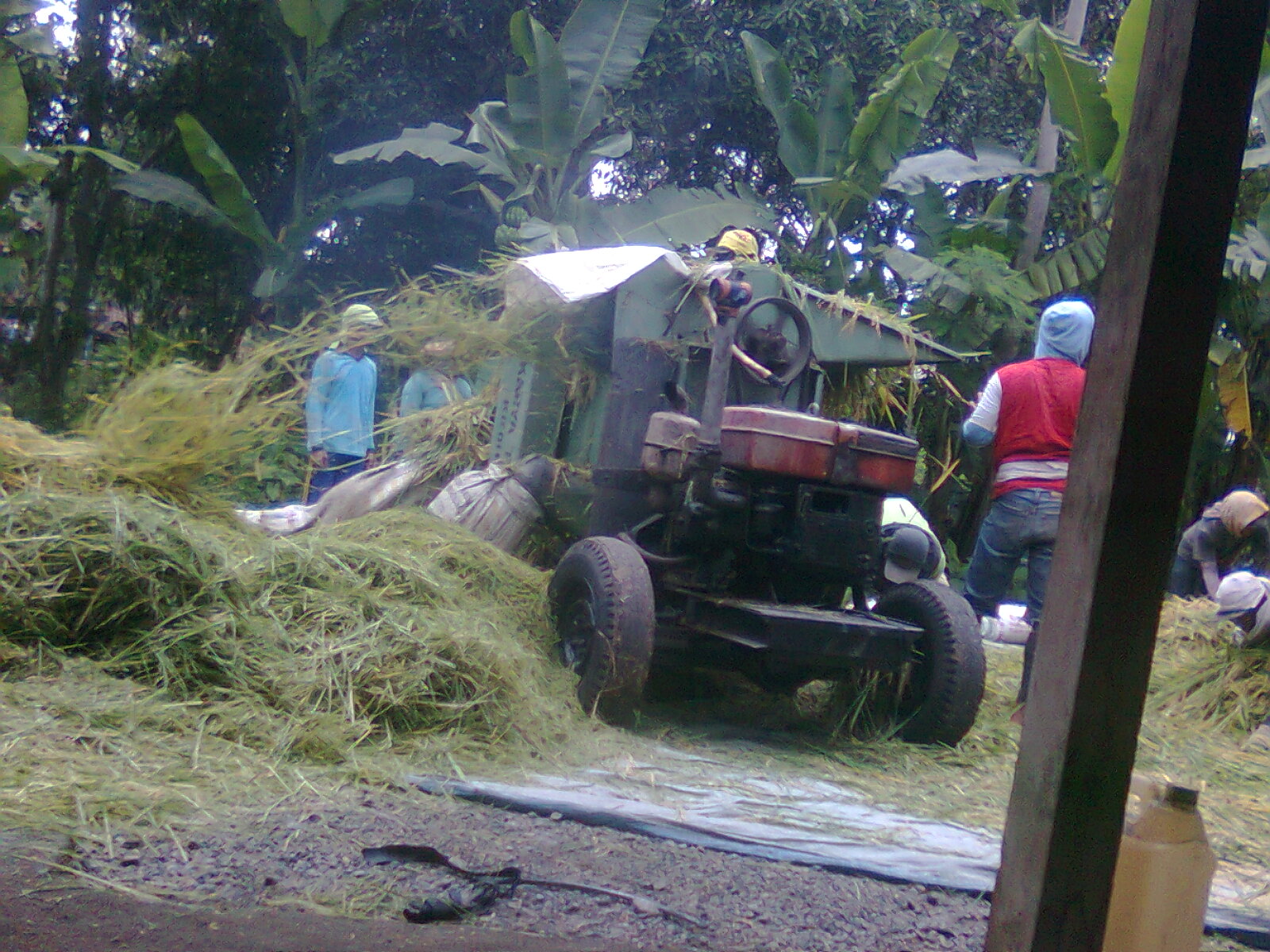 Ini adalah mesin atau alat perontok padi buatan bengkel .Mesin ini sangat membantu pekerjaan petani,yang dulunya untuk memisahkan padi dari jerami harus dinjak injak ,kemudian sedikit lebih cepat dengan dipukul memakai galah,mesin yang dipedal dan sekarang biasa memakai yang seperti ini. memang ada yang buatan pabrik tapi tak cocok untuk lahan sempit dan tak rata.