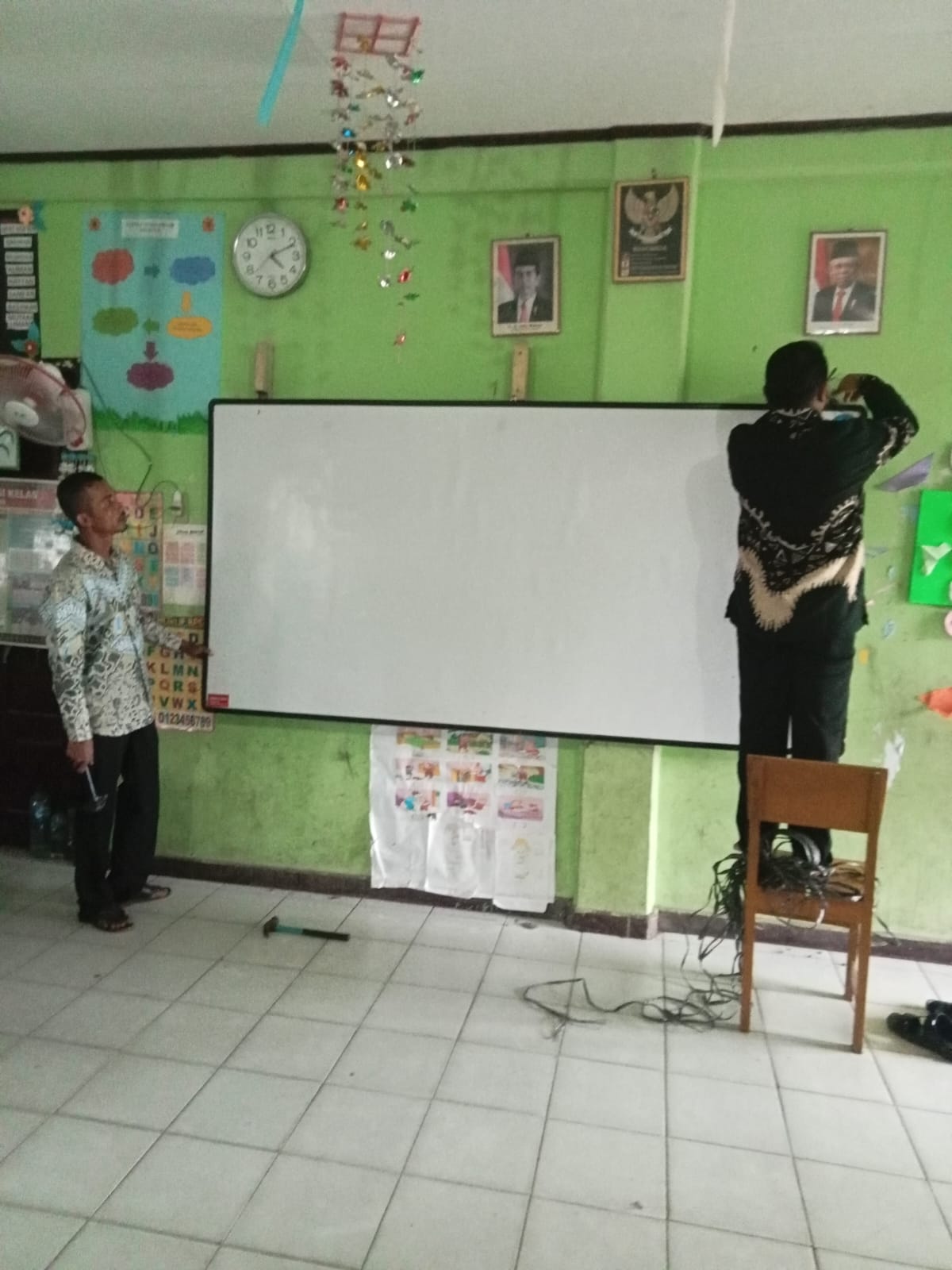 Seperti hari ini, tugas selain mengajar adalah ketika ada laporan dari guru bahwa ada kursi patah, atau papan tulis yang harus dibenarkan maka siap tak siap guru laki laki harus berada di garda terdepan, baju setelan rapi dan celana kain yang tergosok rasanya tak perlu lagi dipersoalkan.
