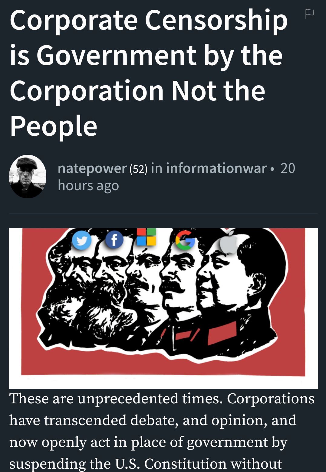 https://steemit.com/informationwar/@natepower/corporate-censorship-is-government-by-the-corporation-not-the-people