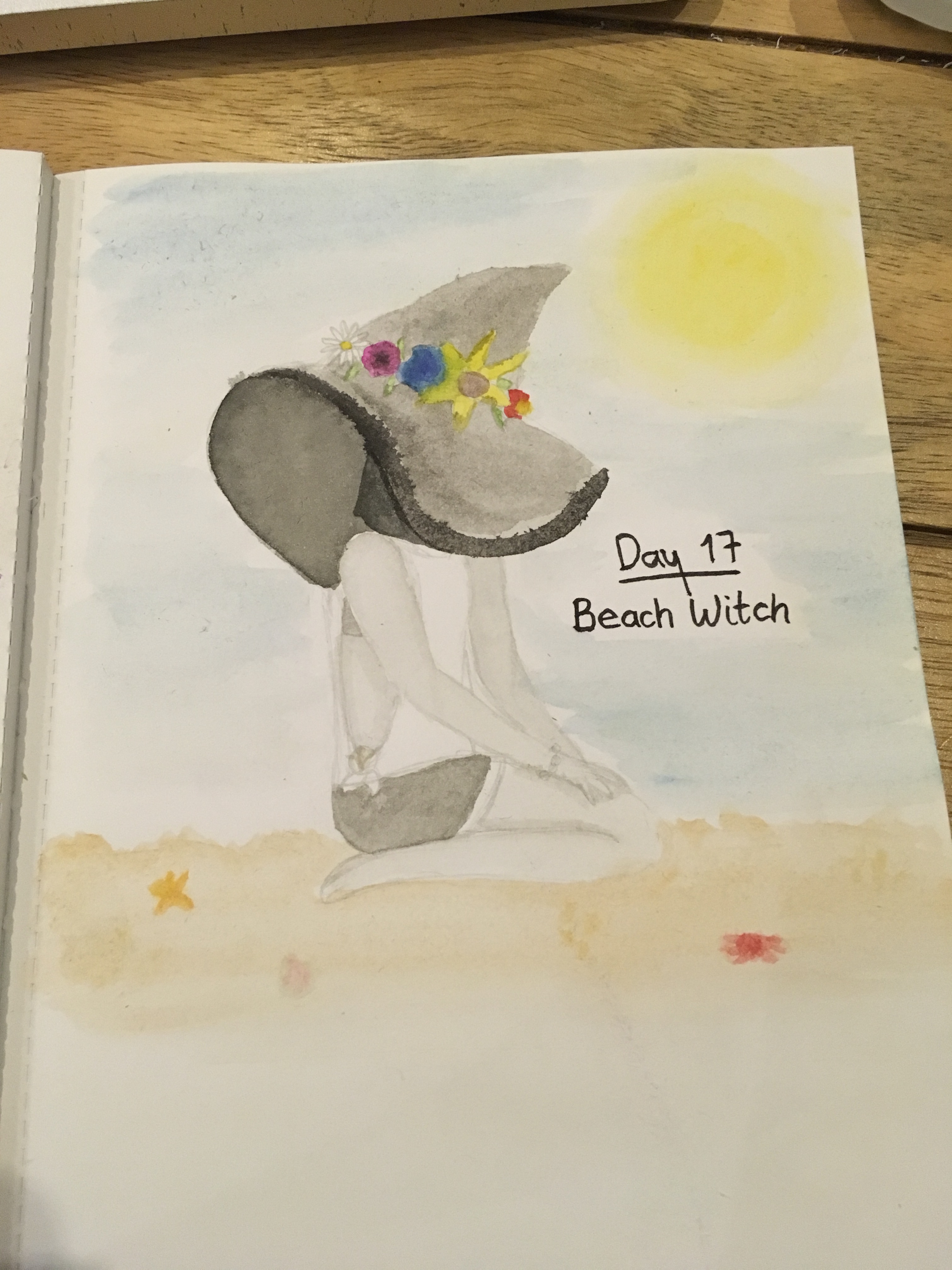 I was thinking about turning this into a pun... Sand-Witch. Not totally original, I know. I decided to just sit her on a beach, instead of turning her into a sandwich-witch-hybrid-thing. I got suuuuper lazy and didn't give her a face. Whoops. And I decided to add colour for once. Did it work?