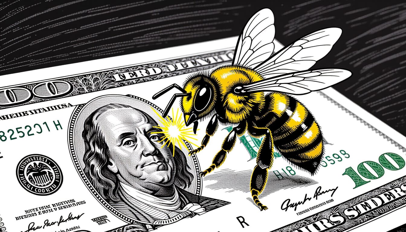 The twelfth prompt was "sting." I thought of a bee stinging a dollar bill for the steemit/hive community. It turns out that Night Cafe does not know which side of the bee contains the stinger.