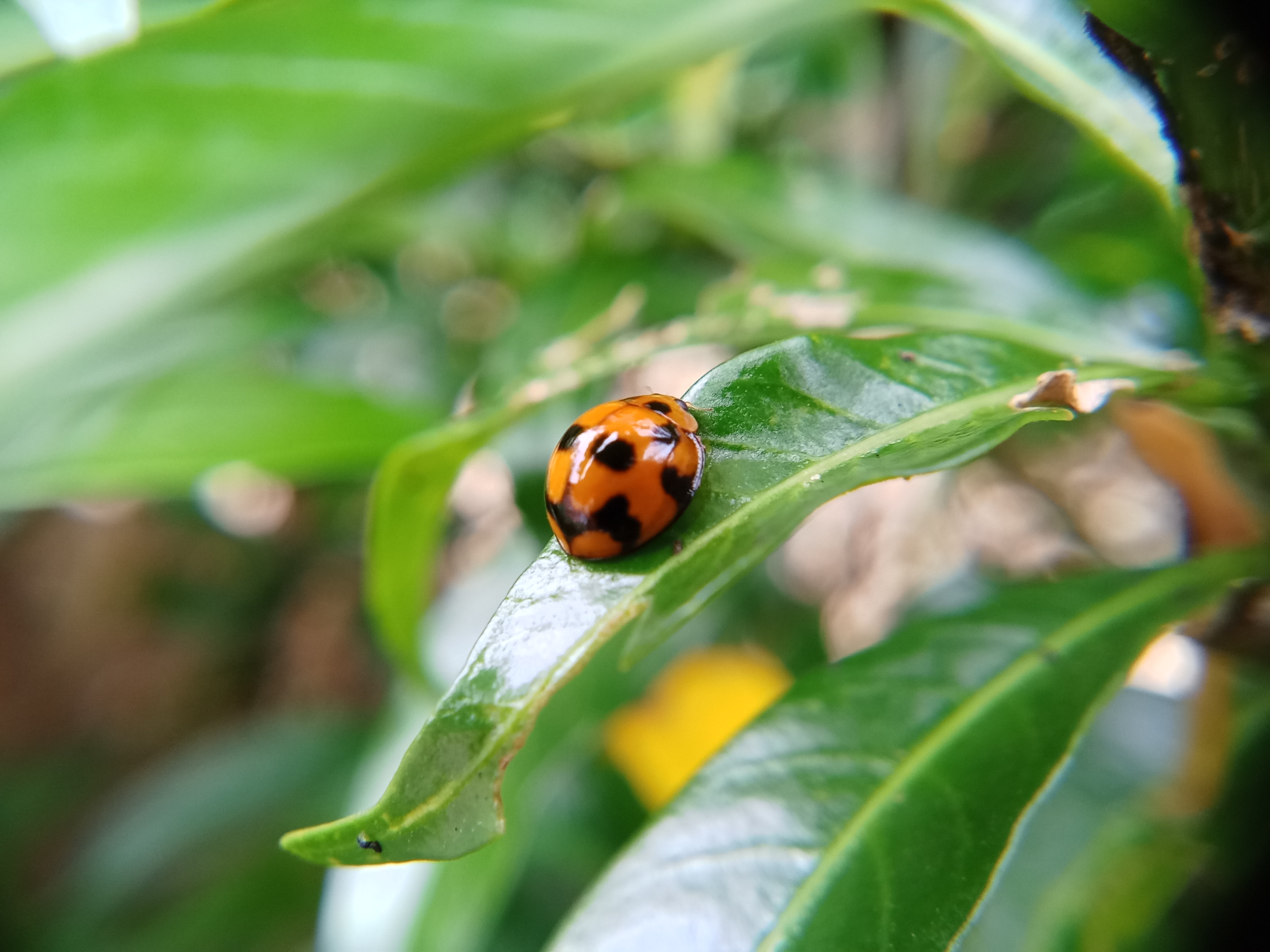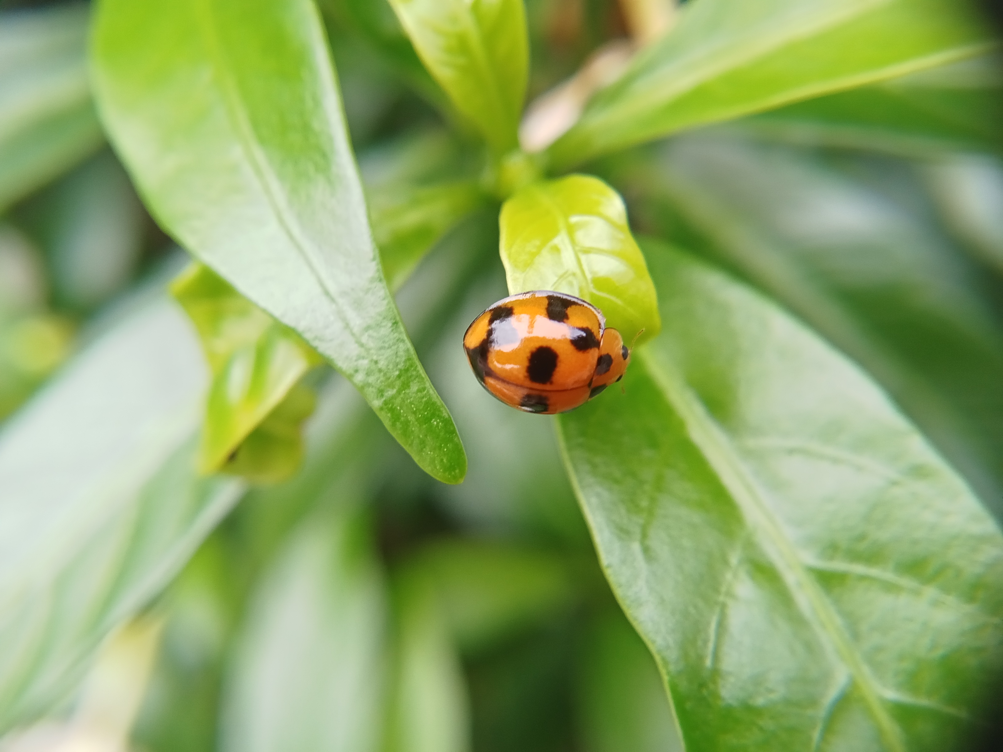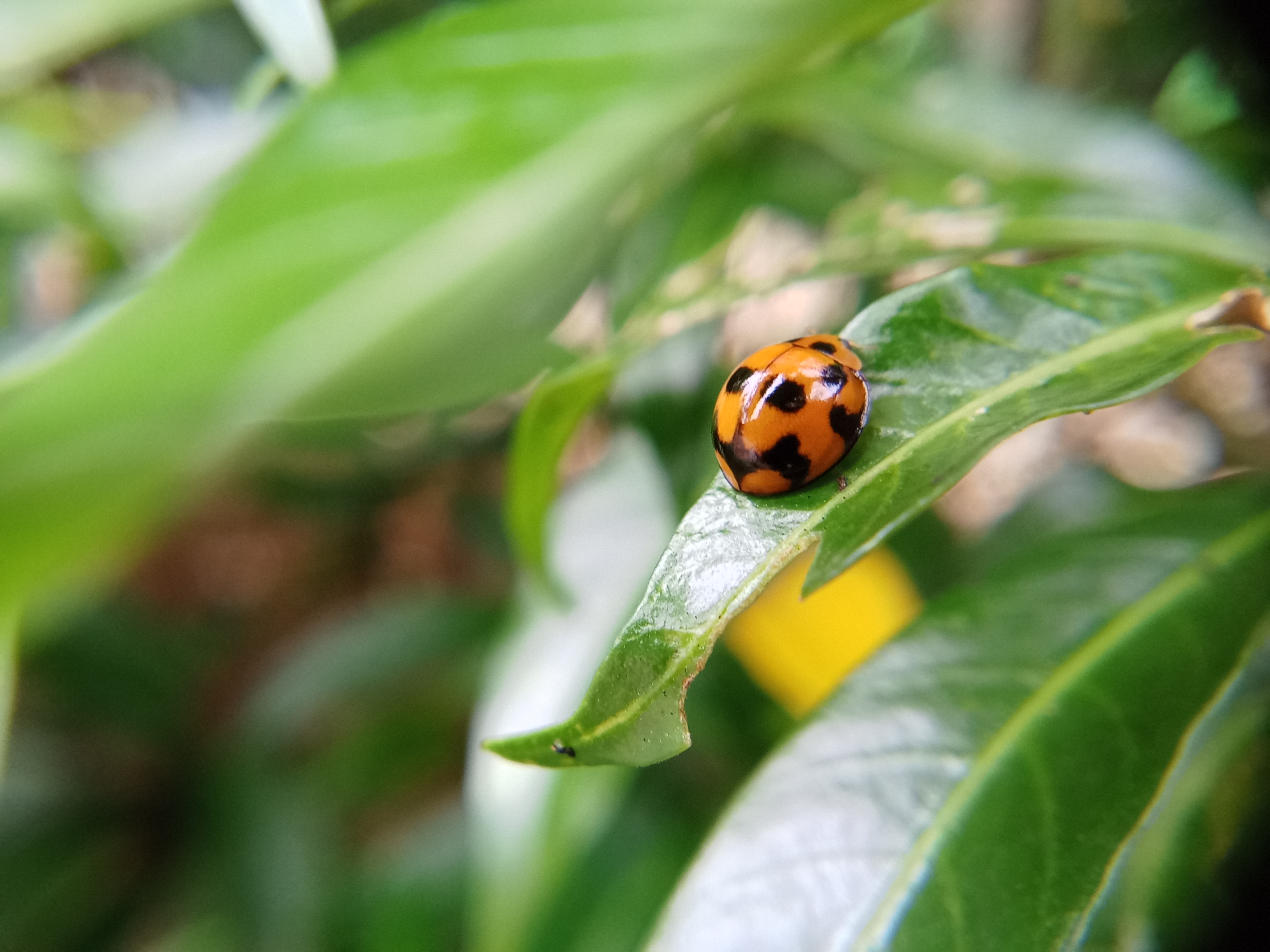 Kumbang lady bird ini memiliki totol totol berwarna hitam pada tubuhnya sehingga membentuk suatu corak yang unik pada hewan.