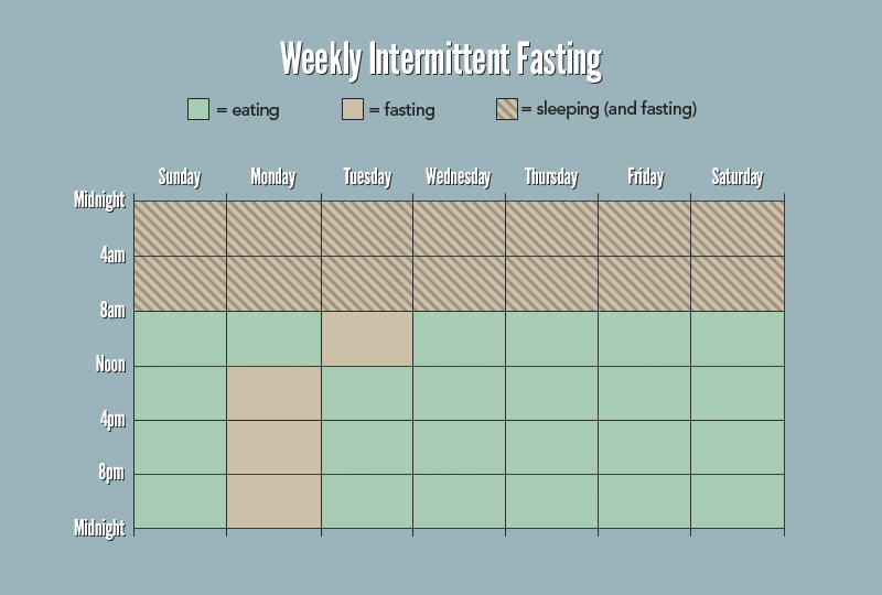- Eat-Stop-Eat: 24-hour fast, at least once or twice a week.