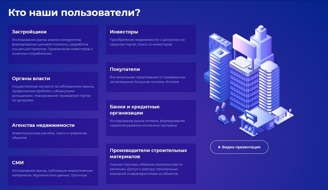 Пользователями платформы уже являются инвесторы, застройщики,покупатели, органы власти, банки и кредитные организации, агенства недвижимости, производители строительных материалов, СМИ.