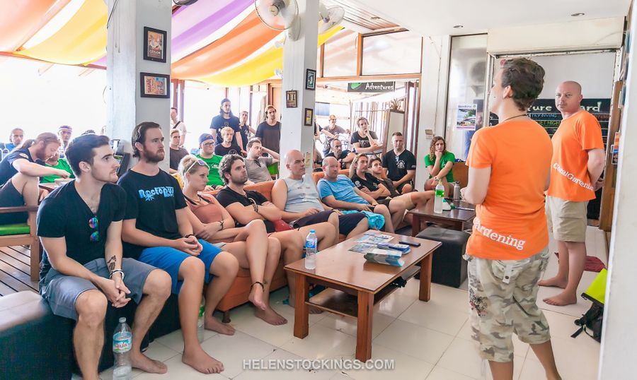 We educate local school kids, dive professionals in dive schools, new divers on dive boats in Koh Tao, Thailand. Also schools, universities and divers in dive schools in the Netherlands. On national and international diving exhibitions we educate and inspire people. Our lectures are about, what coral is, the importance of coral reefs, why coral reefs are threatened and what we can do. We don’t not only focus on local causes, but also about the world wide problems, like pollution, climate change and overfishing. We are in the process of developing an educational program for kids from 5-12 and young people from 13-20. We aim to develop the kids programs to be more suitable for Thai and Indonesian culture and translate these to Thai and Bahasa Indonesia.