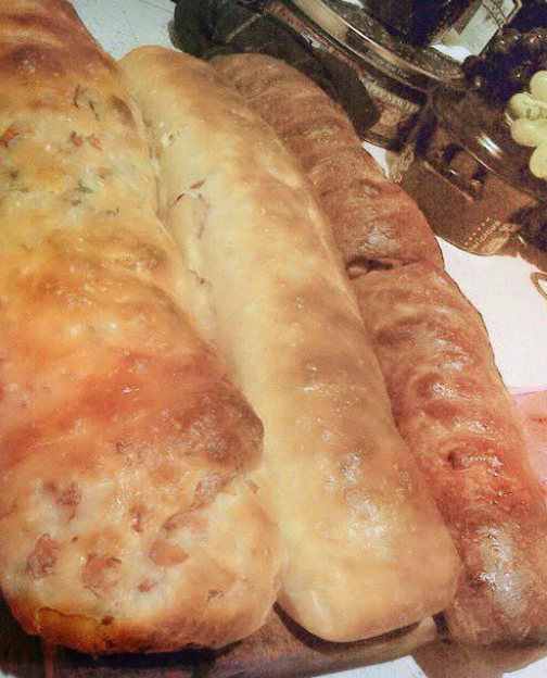 La masa estirada, debe ser sobada con el aceite de la tocineta y colocar el jamón que cubra toda la masa. Ponga varias hileras de la tocineta y sobre esta vierta puñados de pasas y las aceitunas enteras o cortadas. Enrolle sin apretar uniendo bien los bordes. En forma de un brazo. colocar en la plancha donde se va a hornear y dejar reposar por 30 minutos más.