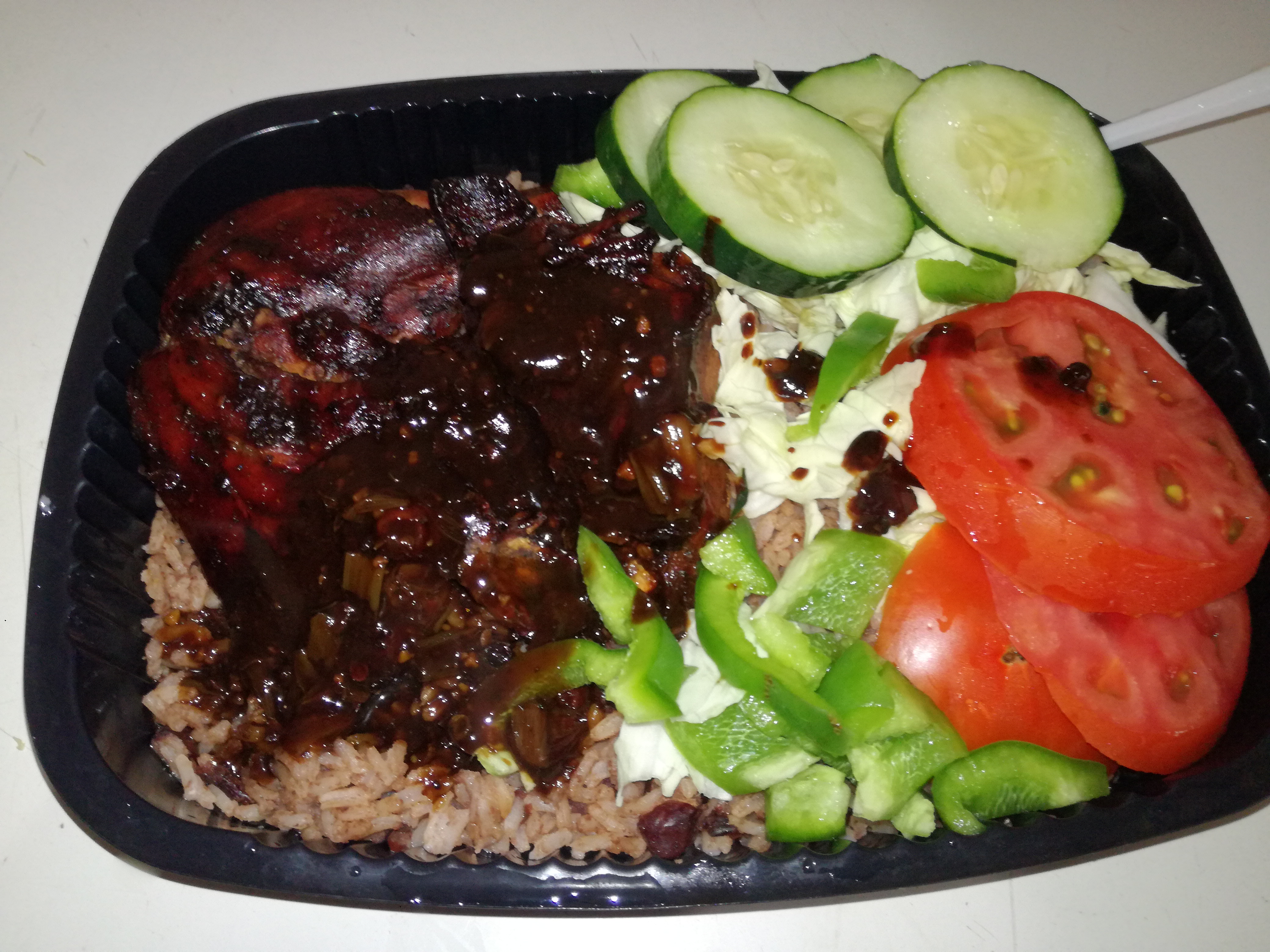 Plain Roast Chicken with Rice and peas with veggies on the side another delicious dish cooked in the oven, as you can see its in a container for storage this dish can be made for lunch or dinner, warning if taken to work you may be subjected to jealousy and begging as a personal chef I can prepare meals for my clients for the week this gives them a luxurious experience knowing they were able to have a little piece of Jamaica come to them.
