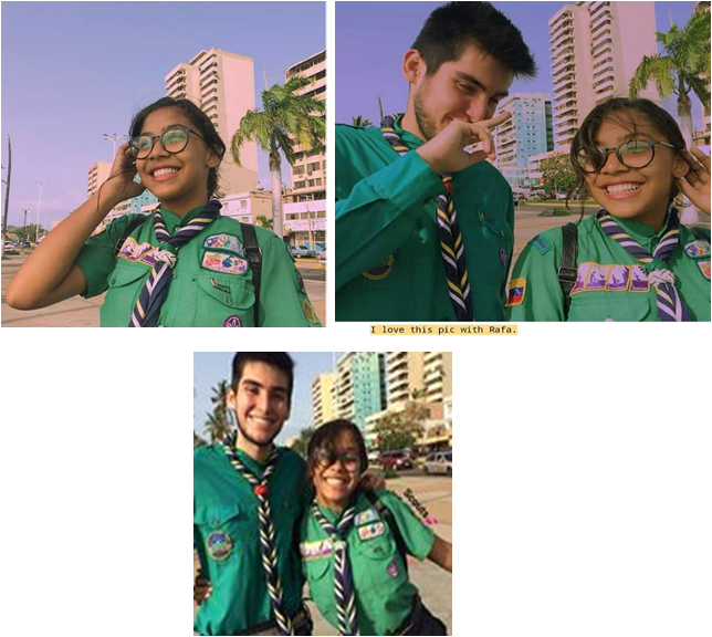 Soy orgullosamente un chica Scout –Exploradora-, brindo mi apoyo a la naturaleza, a los animales y a la comunidad, además de eso, aprendo mucho acerca del día a día; a como sobrevivir en el ambiente, a cómo tratar con la naturaleza y los Scouts me aporta una gran plataforma para realizar proyectos que les permitan a los jóvenes hoy en día aprender tanto como yo y mejorar como persona, los scouts hacemos un bien en común, un bien unidos todos como hermandad que somos. Me satisface de gran manera proporcionar ayuda a los demás y los Scouts me brinda eso, y por eso decidí hace mucho pertenecer allí.