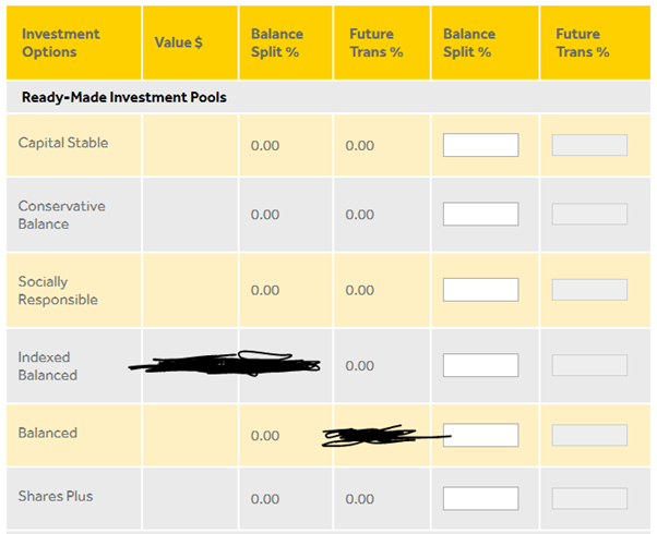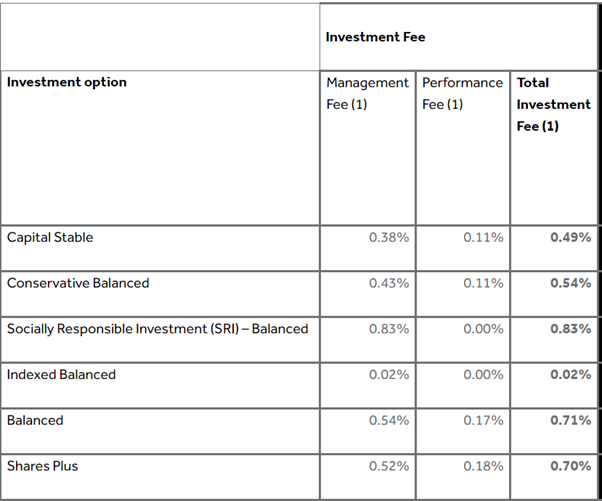 However, if you are to choose your Pre-mixed investment options, you could choose: Capital stable, Conservative Balance, Socially Responsible, Indexed Balanced, and Shares Plus.