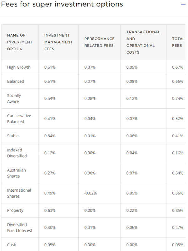 Overall the default Balanced option charges 0.71% investment fee plus a $78 p.a administration fee.