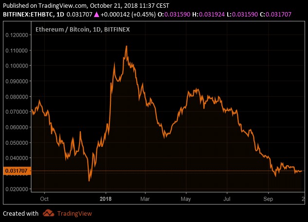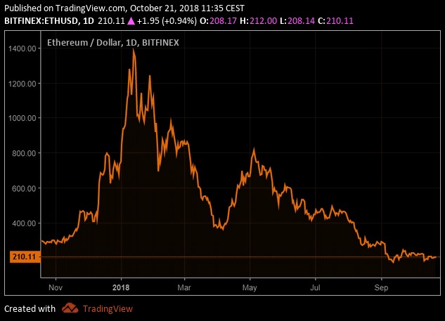 Ether fell to approximately 167 USD in September, but ultimately the 200 dollar line seems to be some sort of support. On the top, the value of one ether was more than 0.11 Bitcoin, now it is only 0.031 (about a quarter of the top value). Ether is moving near 10 months lows now in Bitcoins and near 15 months low in USD terms.