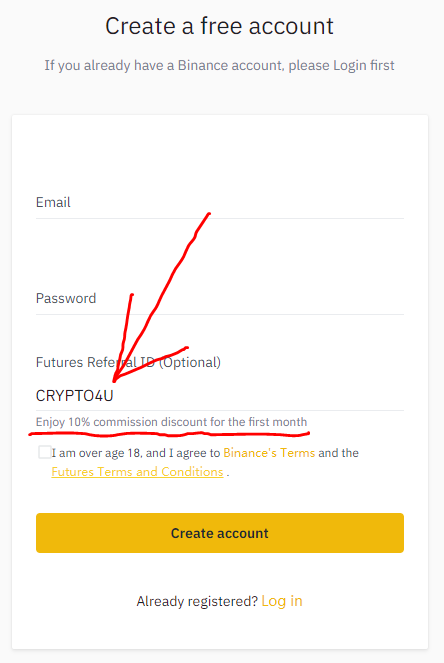BINANCE के साथ पंजीकरण करते समय आप पहले से ही प्रोमो कोड दर्ज कर सकते हैं ताकि कमीशन में 10% की कमी आए (यदि आप अभी तक Binance exchange के साथ पंजीकृत नहीं हैं, तो छूट के लाभ के लिए हमारे कूपन कोड J2X4E7UN से करें, लेकिन कोड के दौरान दर्ज किया गया Binance.com पर पंजीकरण आपको केवल स्पॉट और मार्जिन ट्रेडिंग के लिए छूट प्रदान करता है। फ्यूचर्स पर भी छूट का लाभ लेने के लिए, नीचे दिखाए अनुसार CRYPTO4U कोड दर्ज करना होगा।…