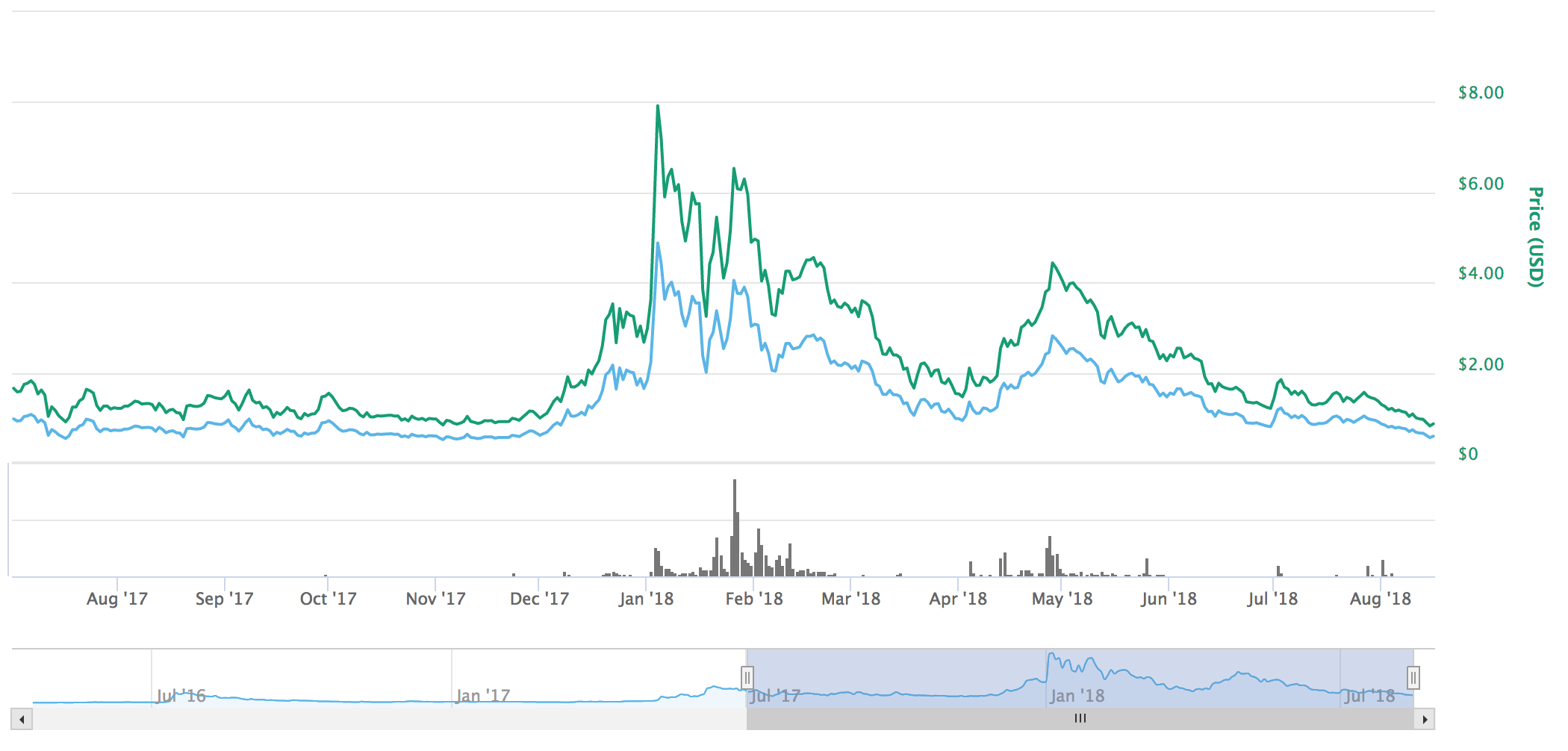 The price of Steem experienced a large amount of volatility in 2018. The price of Steem was around $1 usd to Steem at the end of 2017. At the beginning of 2018 Steemit experienced a large bull run with price surging to nearly $10 dollars. The price experienced high volatility during the month of February and then began to settle down during the month of March. After this highly volatile start to the year, the Steem price settled down for a period. The month of may brought about a second, minor, bull run bringing the price back up to $4 dollars. The price continued on it’s descent during the months of June and July, bringing us closer to our current price of approximately eighty cents. The current position is the lowest price the crypto coin has seen since November of 2017. Remember, the low of last year was quickly followed by the new all time high that we experienced in January of 2018 with the price of the cryptocurrency reaching an all time high of $8.57 dollars per coin. While it is important to remember the inherent volatility and seeming randomness of the price of cryptocurrencies, we are experiencing similar market conditions to the ones that existed in the months leading up to this years all time high. Expect to see potential further decline in the Steem price before any major correction to occur.