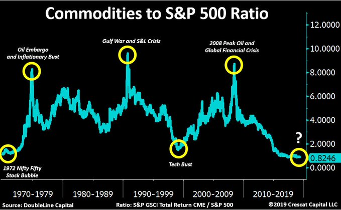 The graph above, from Crescat Capital LLC, shows that the S&P GSCI / S&P 500 index ratio has reached a level that we last saw during the 1970s. In other words, ordinary shares have outperformed the commodity sector in recent years.