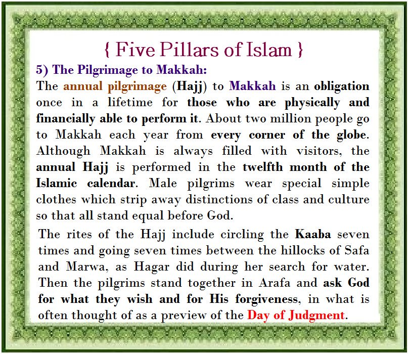 The Five Pillars of Islam are the framework of the Muslim life. They are the testimony of faith, prayer, giving zakat (support of the needy), fasting during the month of Ramadan, and the pilgrimage to Makkah once in a lifetime for those who are able.