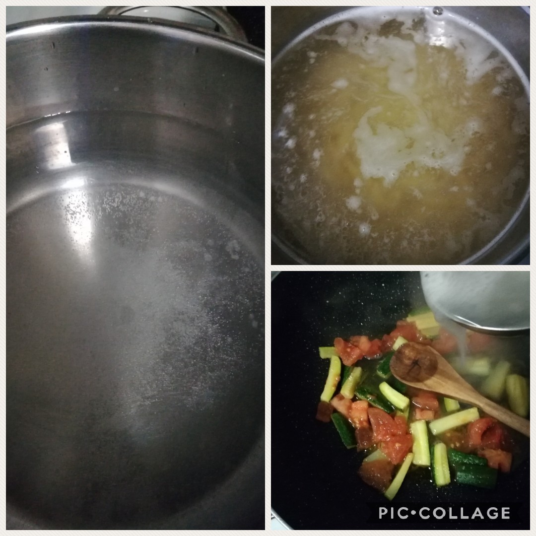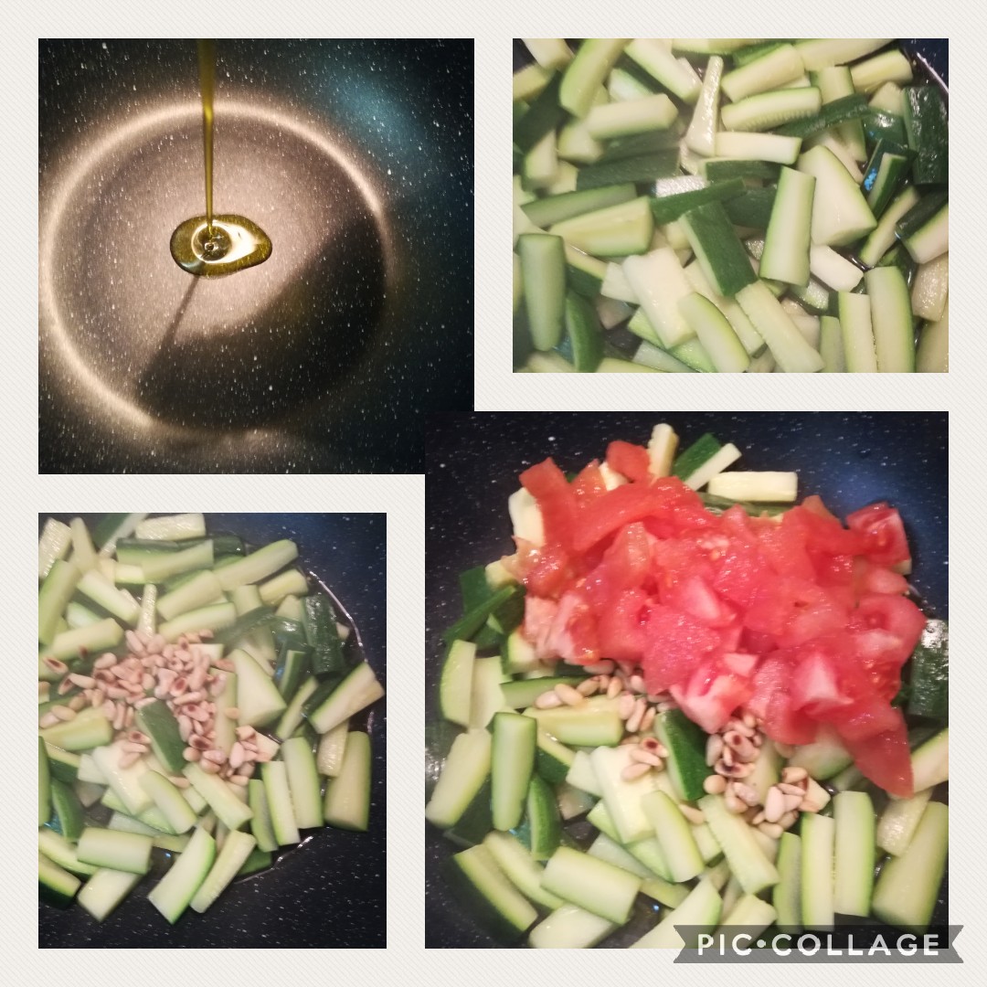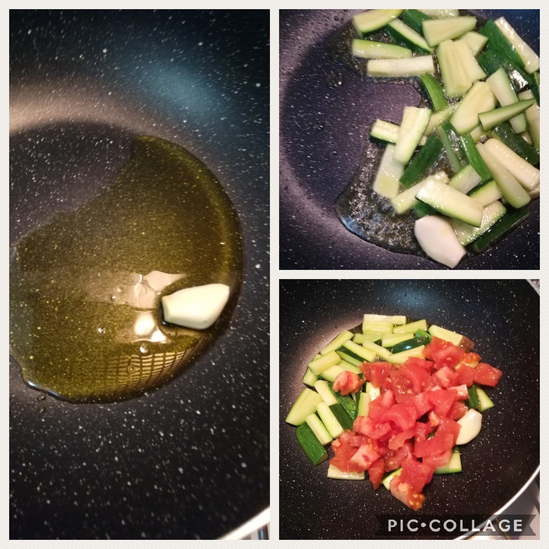 Mettete il pesto da parte e proseguite con la preparazione della pasta. Mentre bolle l'acqua in una padella antiaderente mettete uno spicchio d'aglio con un filo d'olio. Ora mettete il resto delle zucchine e dei pomodori.