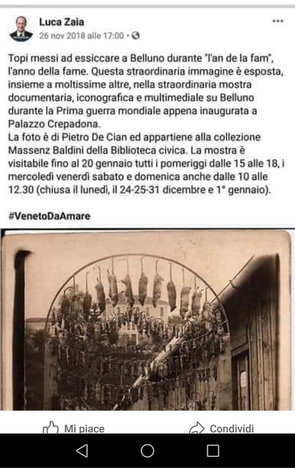 Il lato buffo della situazione dal quale può essere tratta - se vogliamo - una morale è che se si va a scorrere all'indietro la bacheca facebook dello stesso Zaia ci si imbatte in un suo vecchio post nel quale racconta che anche nella veneta Belluno avevano una certa di mestichezza con piatti a base di topi. Se noi ci dimentichiamo di ciò che diciamo e scriviamo sui social network questi tengono invece una memoria eterna delle nostre parole. Un po' di prudenza non farebbe male a Zaia (e penso a nessuno di noi).