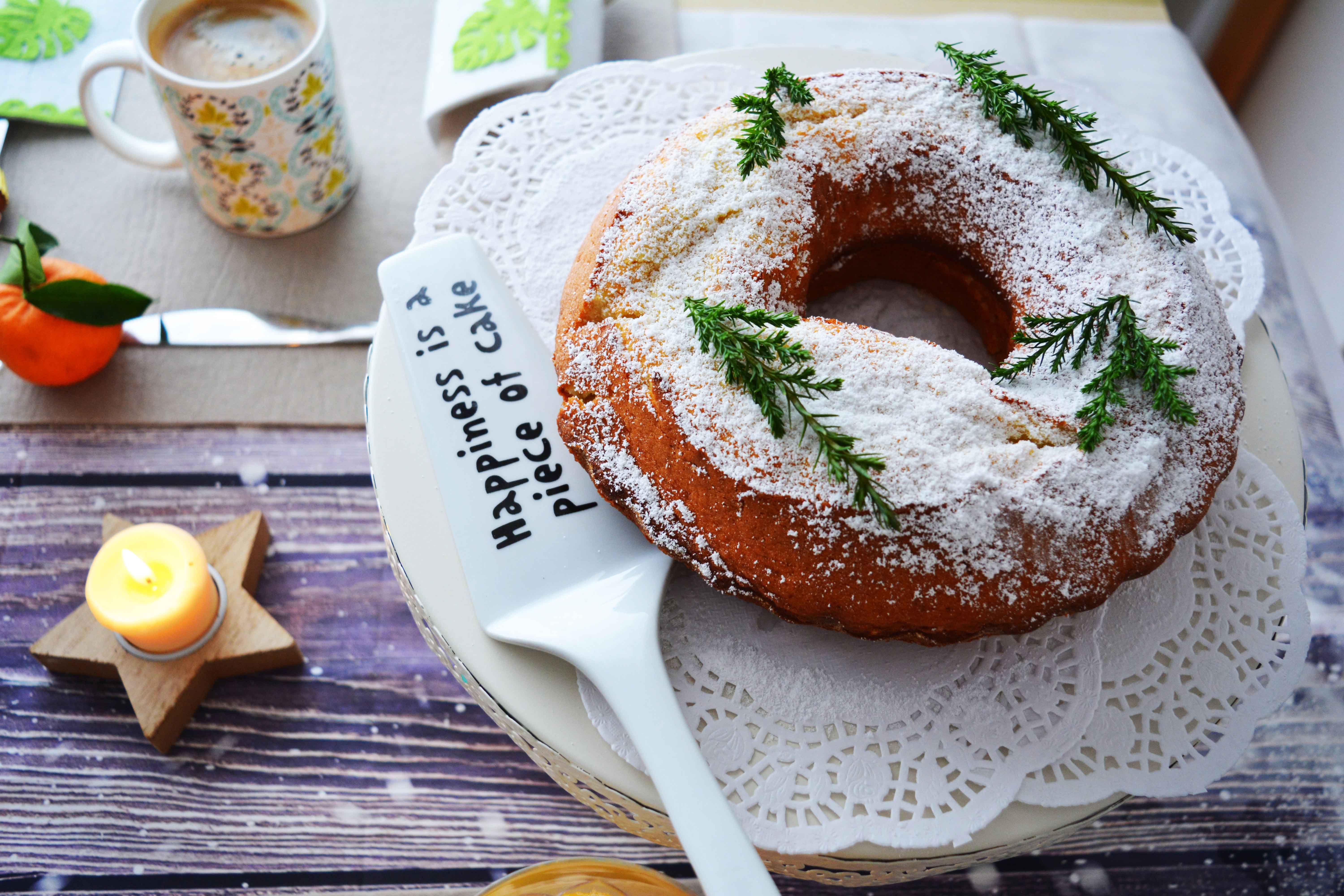 Ho poi preparato una bella ciambella, di quelle leggere che non appesantiscono troppo per questi giorni di festa e grandi abbuffate. (Vi metterò presto la ricetta semplicissima). Ho deciso di spolverarci su una buona dose di zucchero a velo e per decorare qualche rametto di cipresso.