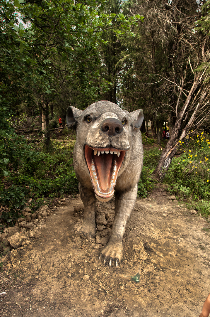 A prima vista ricorda un gigantesco lupo. Le sue dimensioni sfiorano i 2 metri di altezza e quasi i 4 di lunghezza. Come si vede dal modello da me fotografato questo preistorico mammifero presentava una bocca enorme e denti anteriori appuntititi.