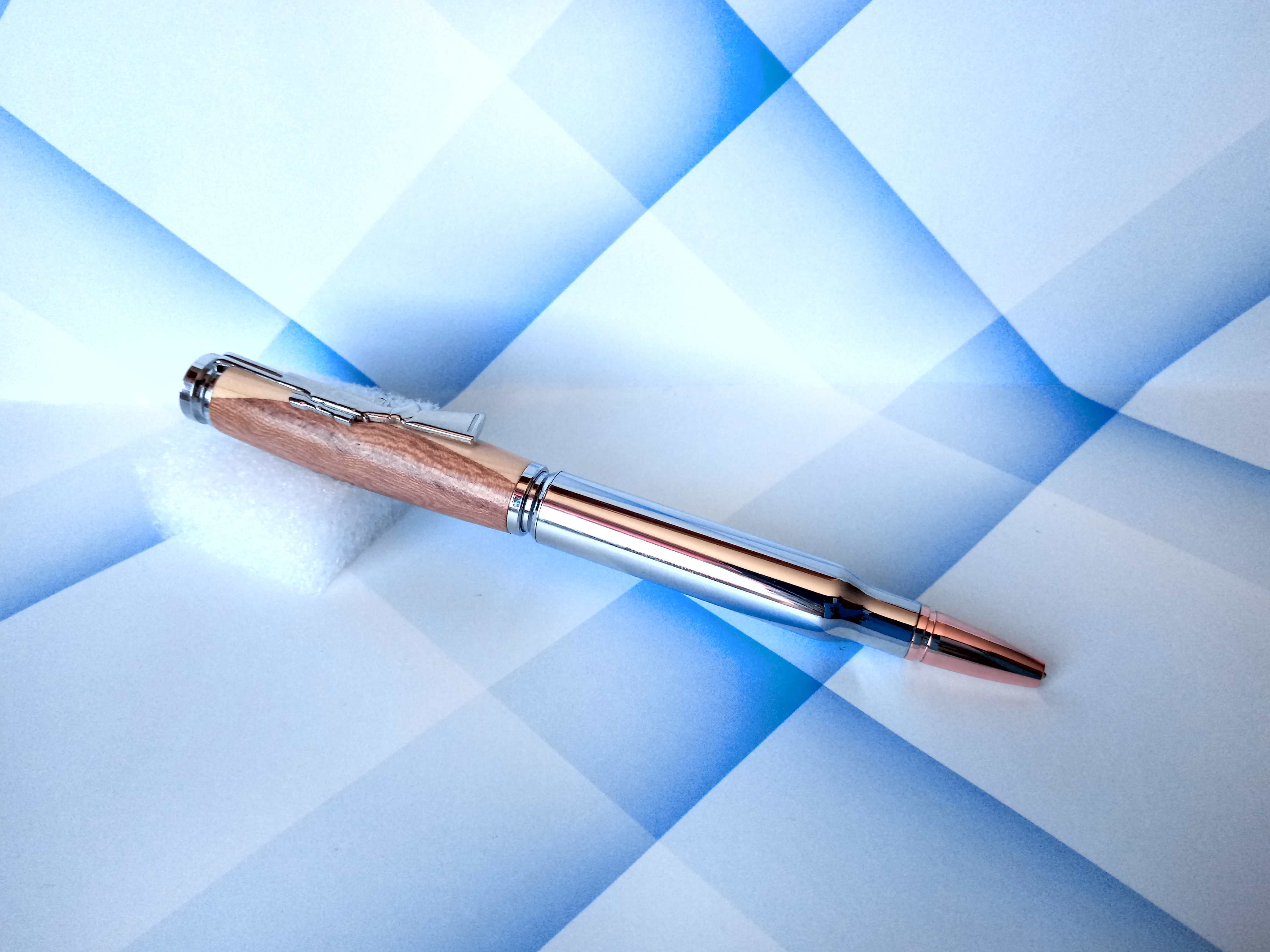 Penna a sfera roller in legno di mogano e cipresso a forma di pallottola.