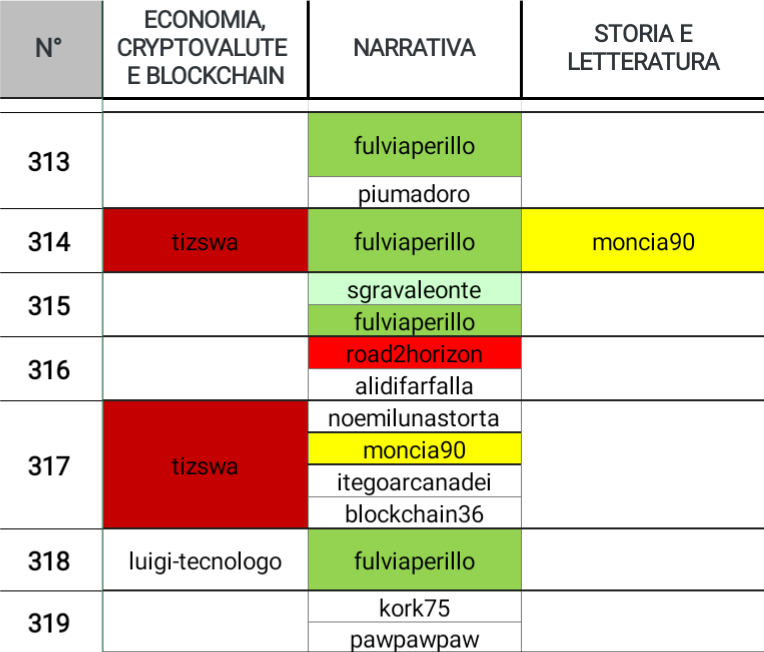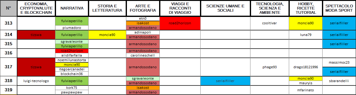 Dunque, quali sono le categorie che questa settimana hanno riscosso più successo? Chi sono gli autori che hanno saputo distinguersi su più categorie? Qual è la categoria più scarna?