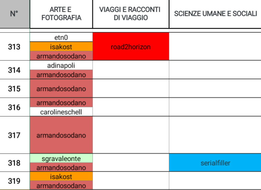 Domina la scena @fulviaperillo con ben quattro posizionamenti, @sgravaleonte e @road2horizon li troviamo rispettivamente anche in ARTE E FOTOGRAFIA e VIAGGI E RACCONTI DI VIAGGIO. @moncia90 oltre eccellere in questa categoria lo troviamo anche in altre due categorie: STORIA E LETTERATURA e HOBBY, RICETTE E TUTORIAL.