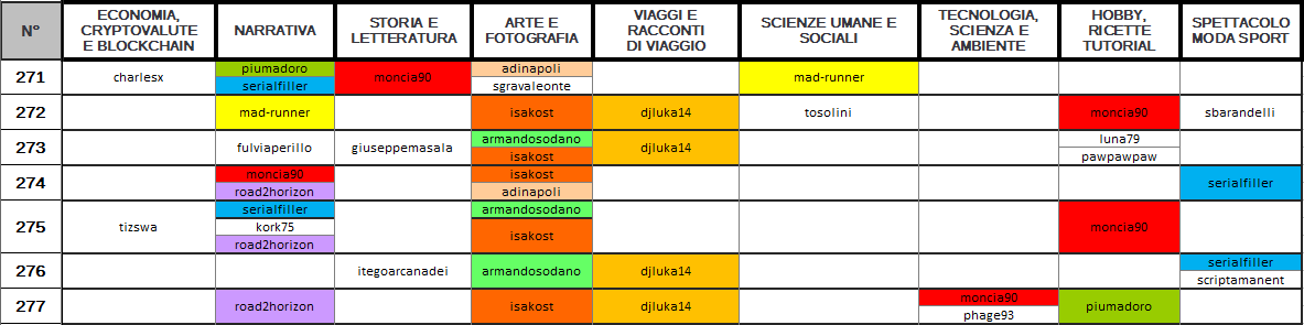 Dunque, quali sono le categorie che questa settimana hanno riscosso più successo? Chi sono gli autori che hanno saputo distinguersi su più categorie? Qual è la categoria più scarna?