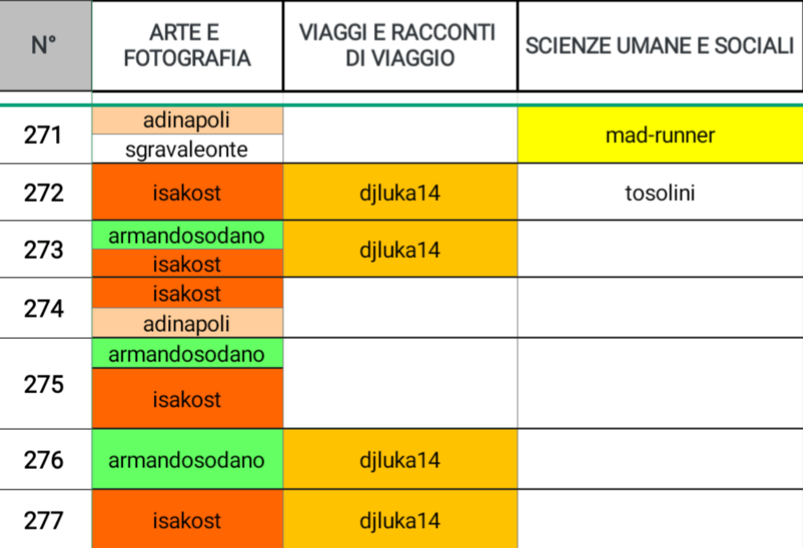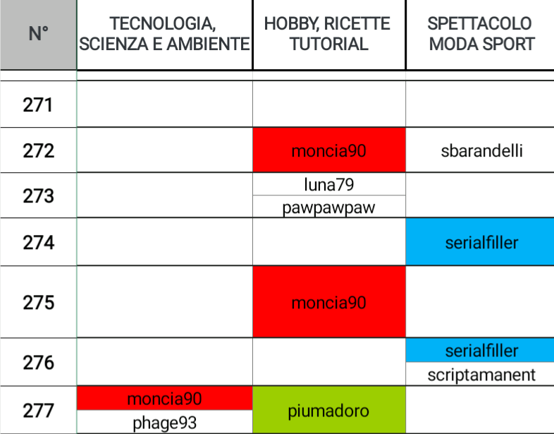 @road2horizon domina la scena con tre posizionamenti, a seguire @serialfiller che eccelle anche in SPETTACOLO, MODA E SPORT, @mad-runner e @piumadoro li ritroviamo rispettivamente anche in SCIENZE UMANE E SOCIALI e HOBBY, RICETTE E TUTORIAL.