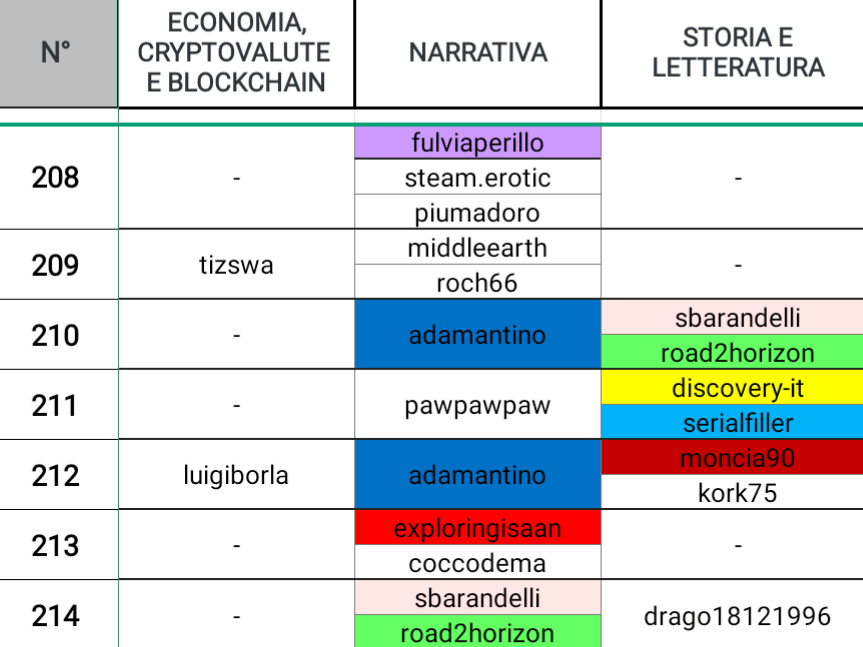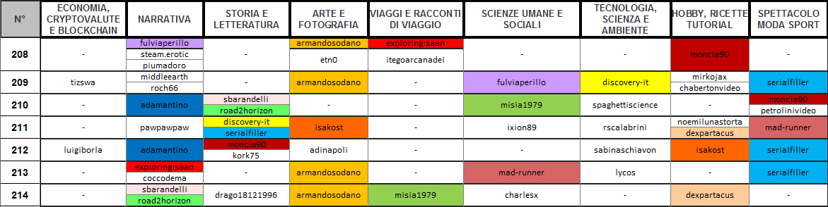 Dunque, quali sono le categorie che questa settimana hanno riscosso più successo? Chi sono gli autori che hanno saputo distinguersi su più categorie? Qual è la categoria più scarna?