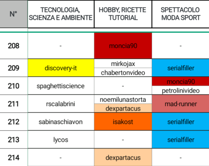 Nuovo miglioramento nella categoria, @discovery-it eccelle anche in TECNOLOGIA, SCIENZA E AMBIENTE, @serialfiller lo ritroviamo anche in SPETTACOLO, MODA E SPORT con altri tre posizionamenti; infine @moncia90 eccelle anche in altre due categorie: HOBBY, RICETTE E TUTORIAL e SPETTACOLO, MODA E SPORT.
