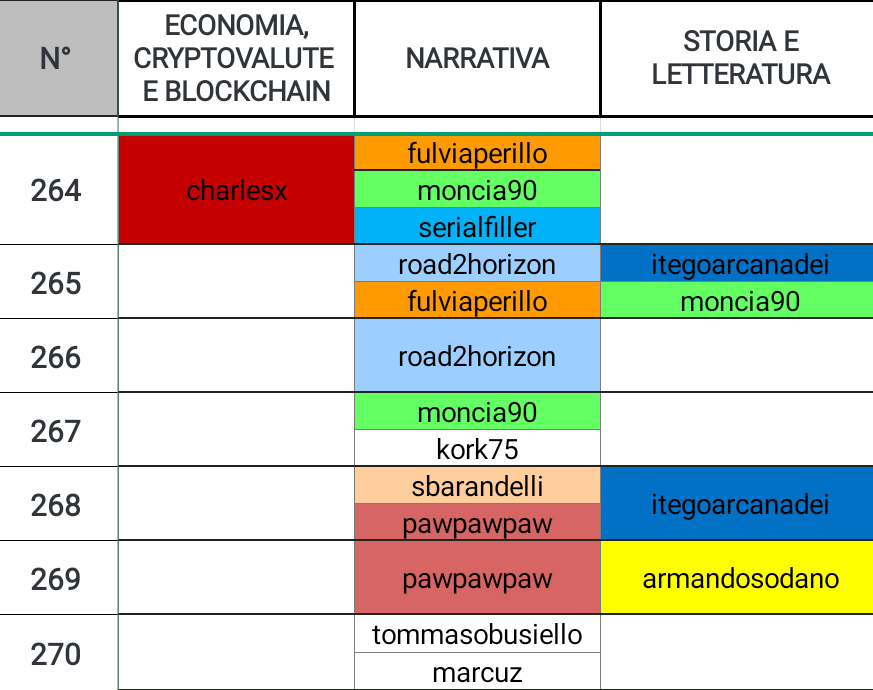 Il titolo di “autore più poliedrico” se lo aggiudica @moncia90 con ben cinque posizionamenti in quattro categorie diverse, complimenti anche a @sbarandelli con tre posizionamenti su tre categorie diverse.