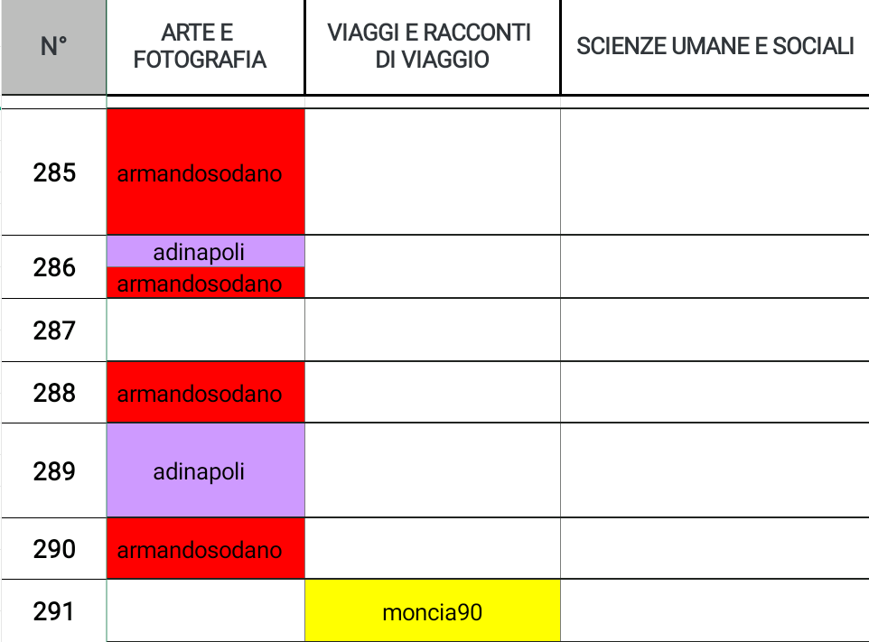@noemilunastorta eccelle su tre giornate, a seguire @fulviaperillo e @sbarandelli con due posizionamenti. @armandosodano lo ritroviamo anche in altre due categorie: ARTE E FOTOGRAFIA e SPETTACOLO, MODA E SPORT con sei posizionamenti totali; @moncia90 eccelle anche in altre tre categorie: STORIA E LETTERATURA, HOBBY, RICETTE E TUTORIAL e VIAGGI E RACCONTI DI VIAGGIO con cinque posizionamenti totali.