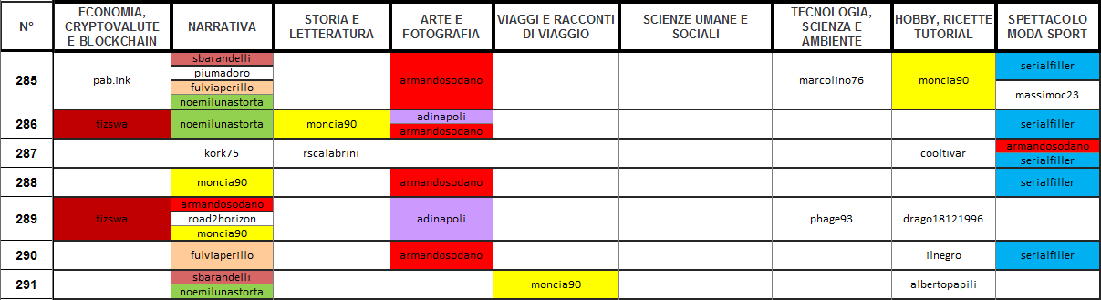 Buona ripresa di alcune categorie sottotono, molto ricche Narrativa, Arte e Spettacolo. Tabelle piuttosto colorate che confermano la tenacia di molti nostri autori, complimenti a tutti.