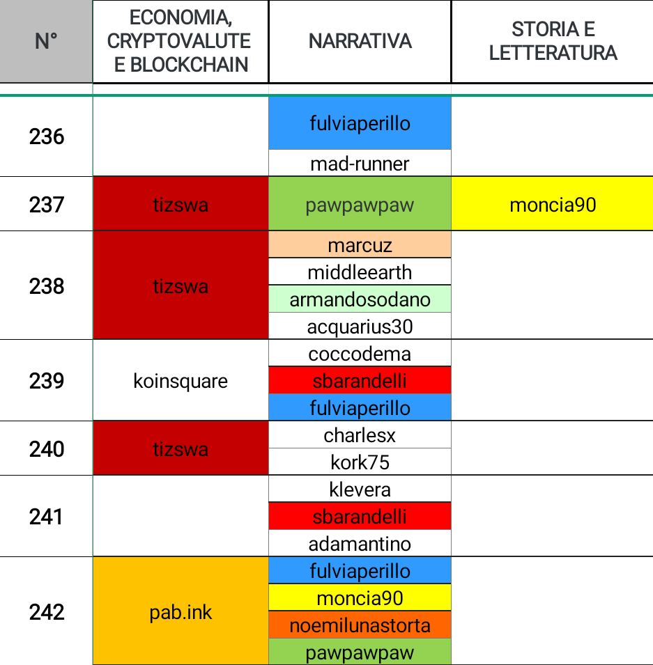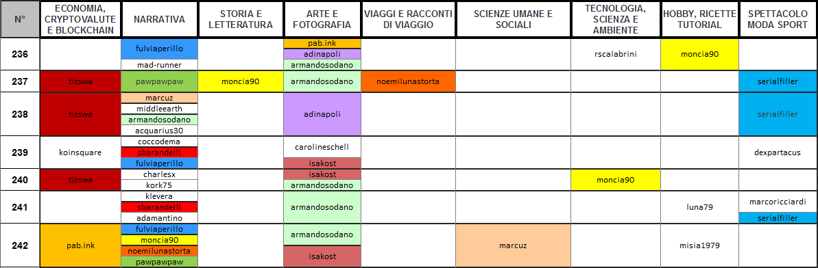 Dunque, quali sono le categorie che questa settimana hanno riscosso più successo? Chi sono gli autori che hanno saputo distinguersi su più categorie? Qual è la categoria più scarna?