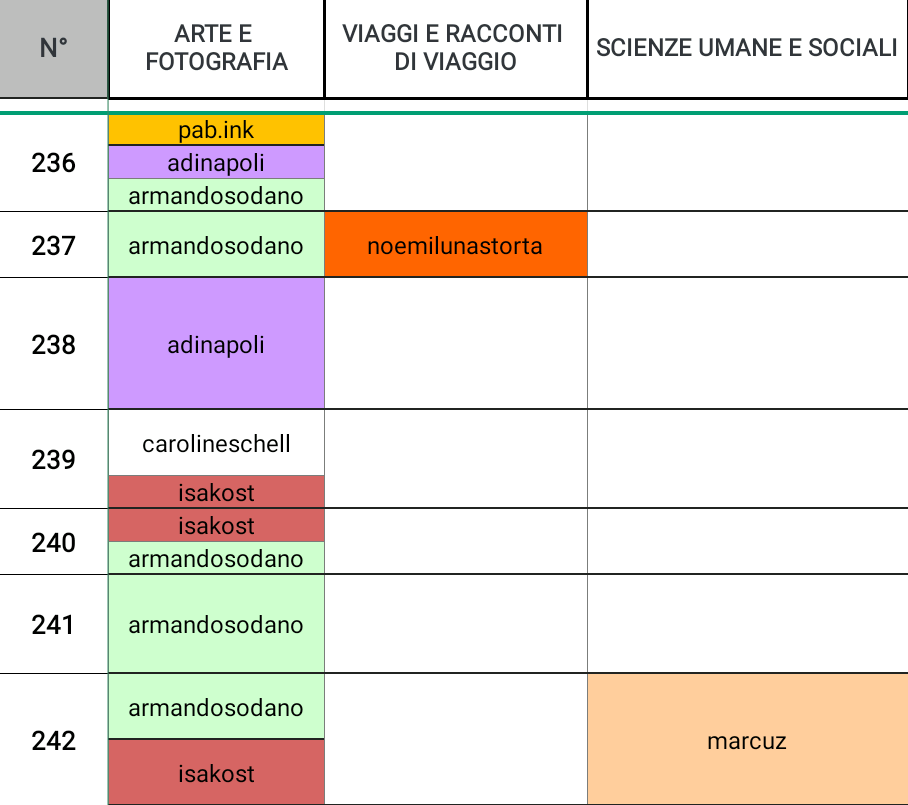 @fulviaperillo eccelle su tre giornate, @pawpawpaw e @sbarandelli vincono su due giornate, @marcuz lo ritroviamo anche in SCIENZE UMANE E SOCIALI, @armandosodano eccelle per ben cinque giornate in ARTE E FOTOGRAFIA, @noemilunastorta la troviamo anche più avanti in VIAGGI E RACCONTI DI VIAGGIO, infine @moncia90 eccelle in altre tre categorie: STORIA E LETTERATURA, TECNOLOGIA, SCIENZA E AMBIENTE e HOBBY, RICETTE E TUTORIAL.