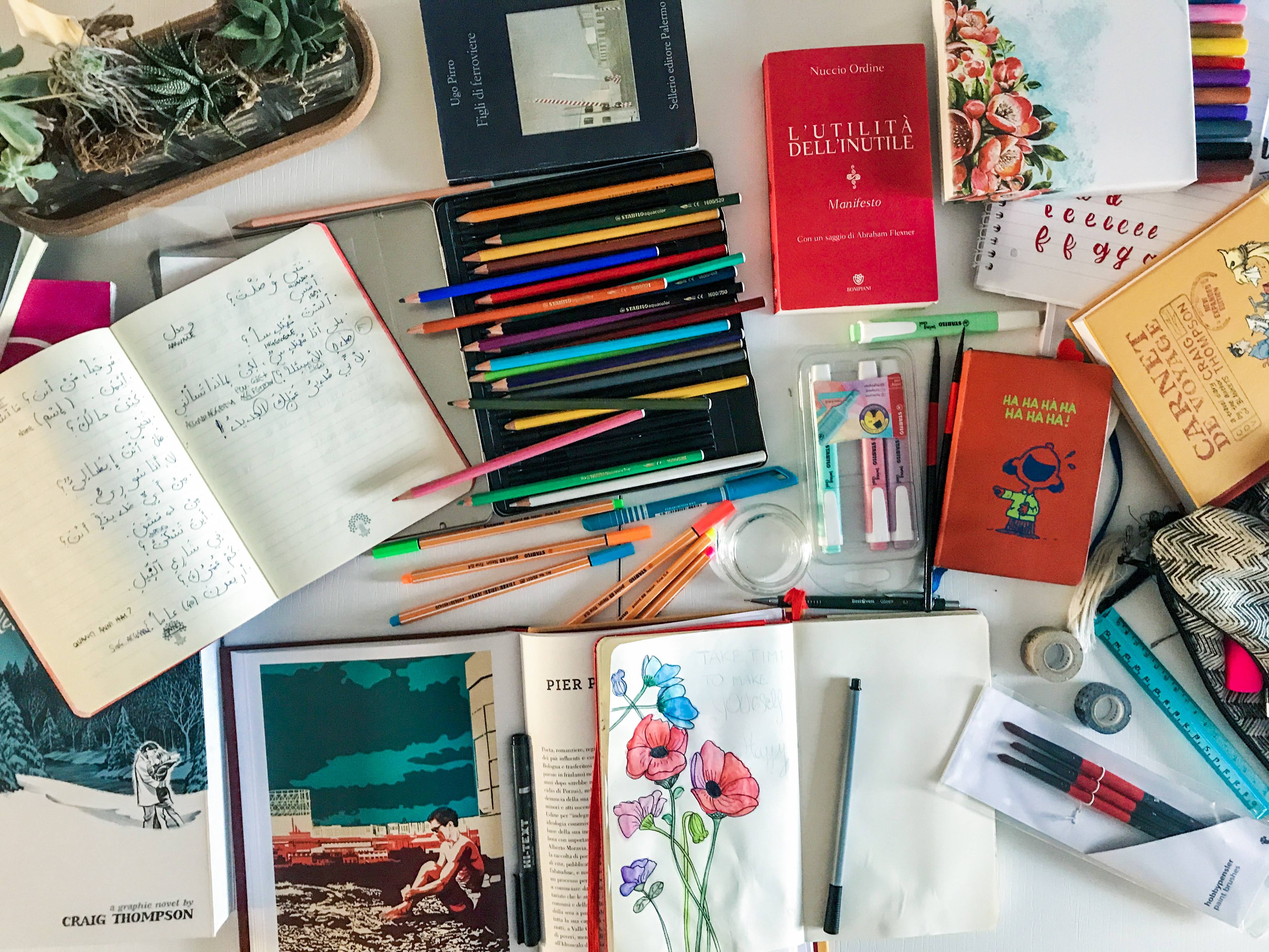 Se si osservasse dall’alto, il tavolo bianco non apparirebbe poi più così bianco. Sarebbe un’insieme di macchie di colore arcobaleno, proveniente dai più disparati oggetti: matite, acquerelli, evidenziatori, libri, fumetti, quaderni, albi illustrati, saggi, quaderni imbrattati di appunti, di disegni, di esercizi di stile, di esercizi di arabo, di esercizi in altre lingue, di prove su prove di sketch, di pensieri pensati dagli altri e di pensieri pensati da sé.