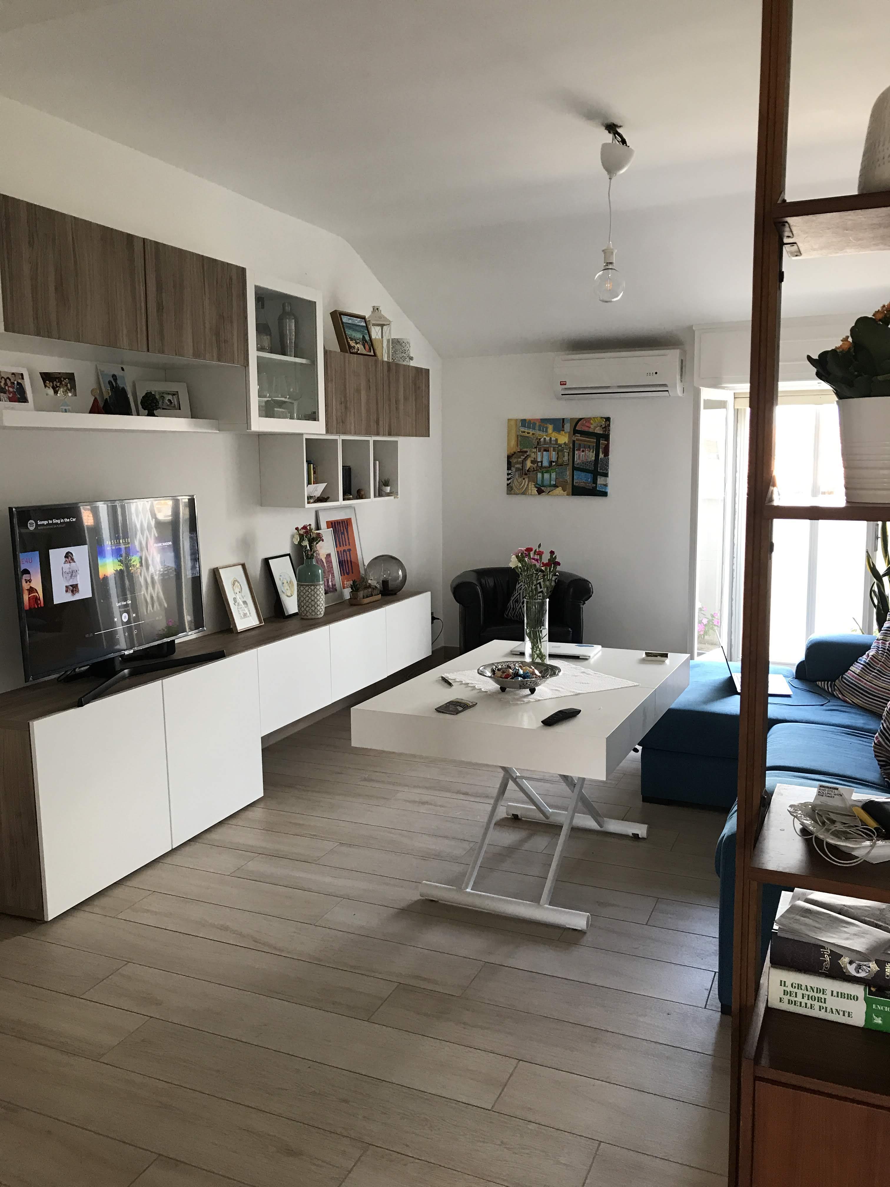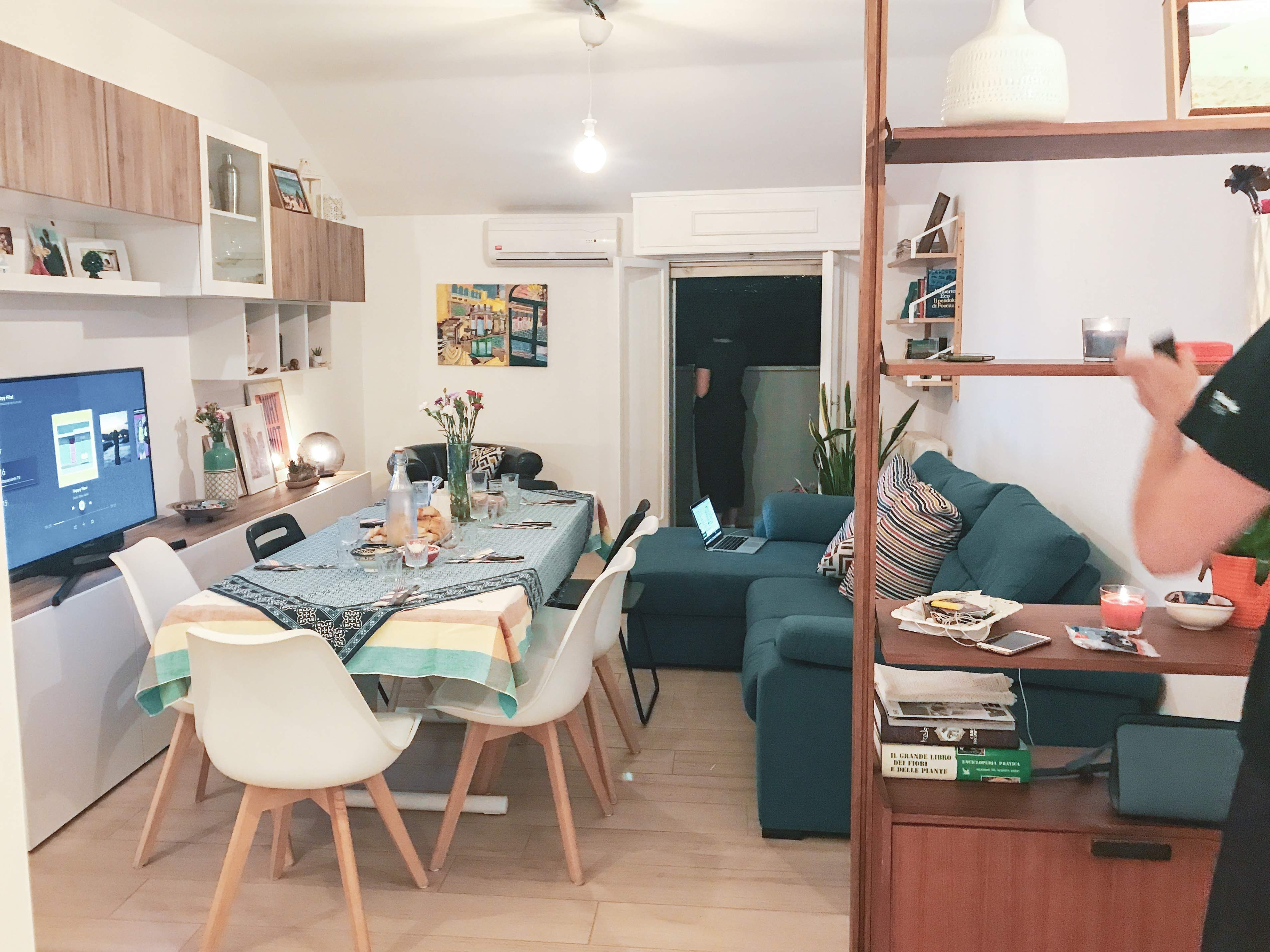 Un tavolo bianco, in un salotto illuminato e caotico, con un divano blu e qualche macchia di verde qui e lì.