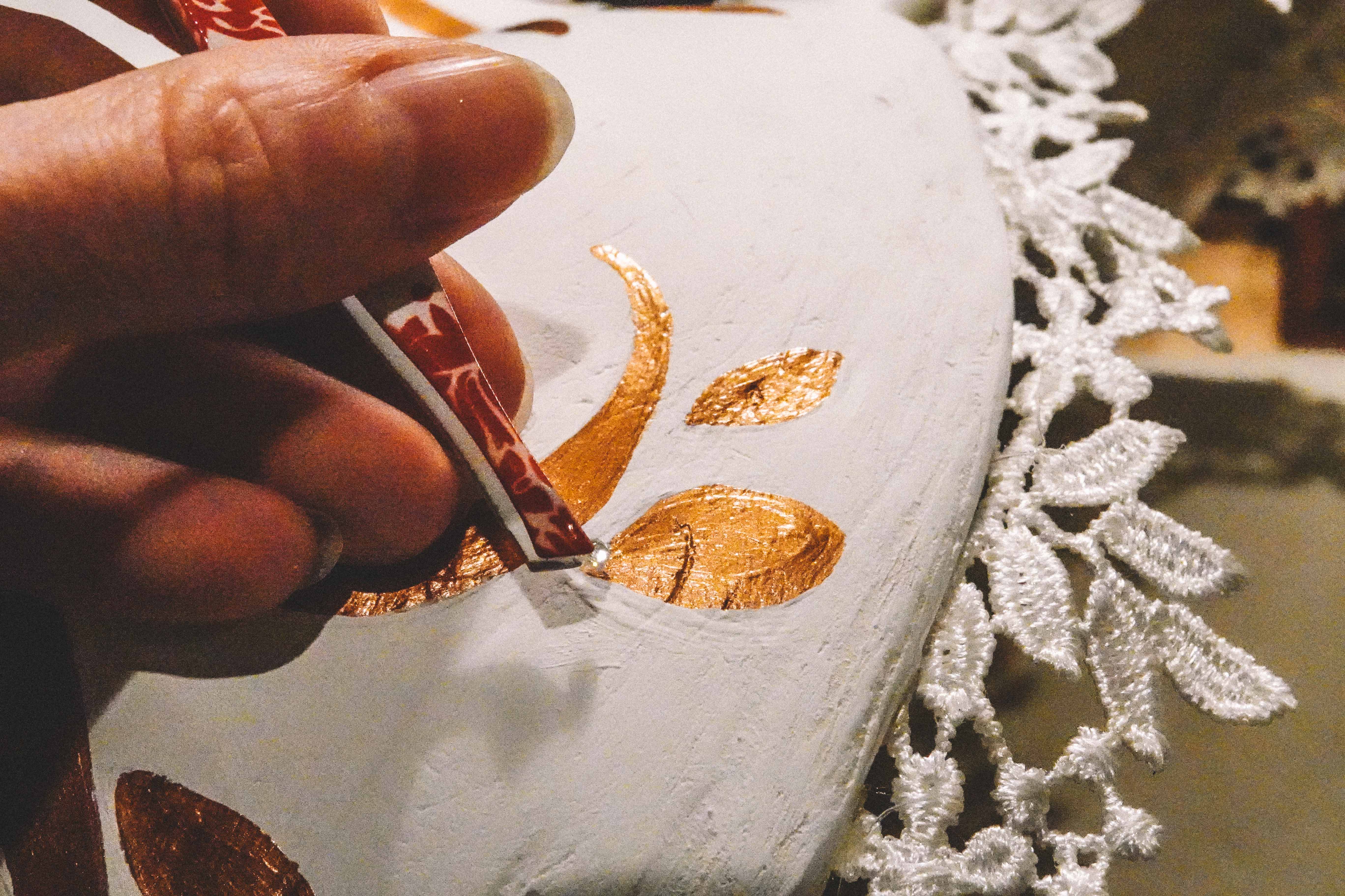 Mi serviva ovviamente l'aiuto prezioso di una cara amica che potesse dargli quel tocco speciale con pennelli e fantasia, e per questo ho chiamato Elena. Con le sue mani piccole e precisissime riesce a trasformare in un gioiello qualsiasi oggetto con qualsiasi tecnica artistica, che spazia dalla pirografia, al disegno, alla pittura, ecc.