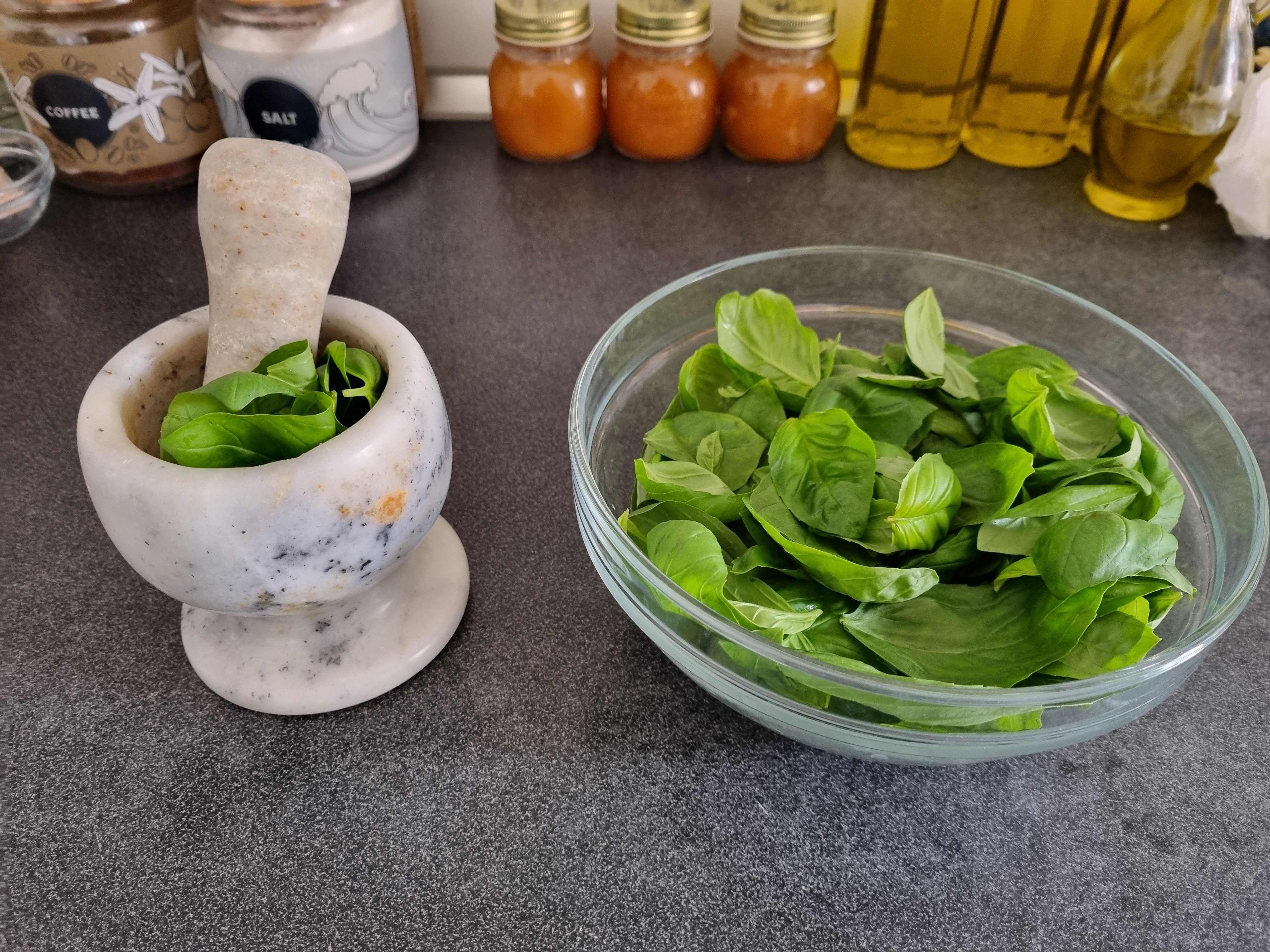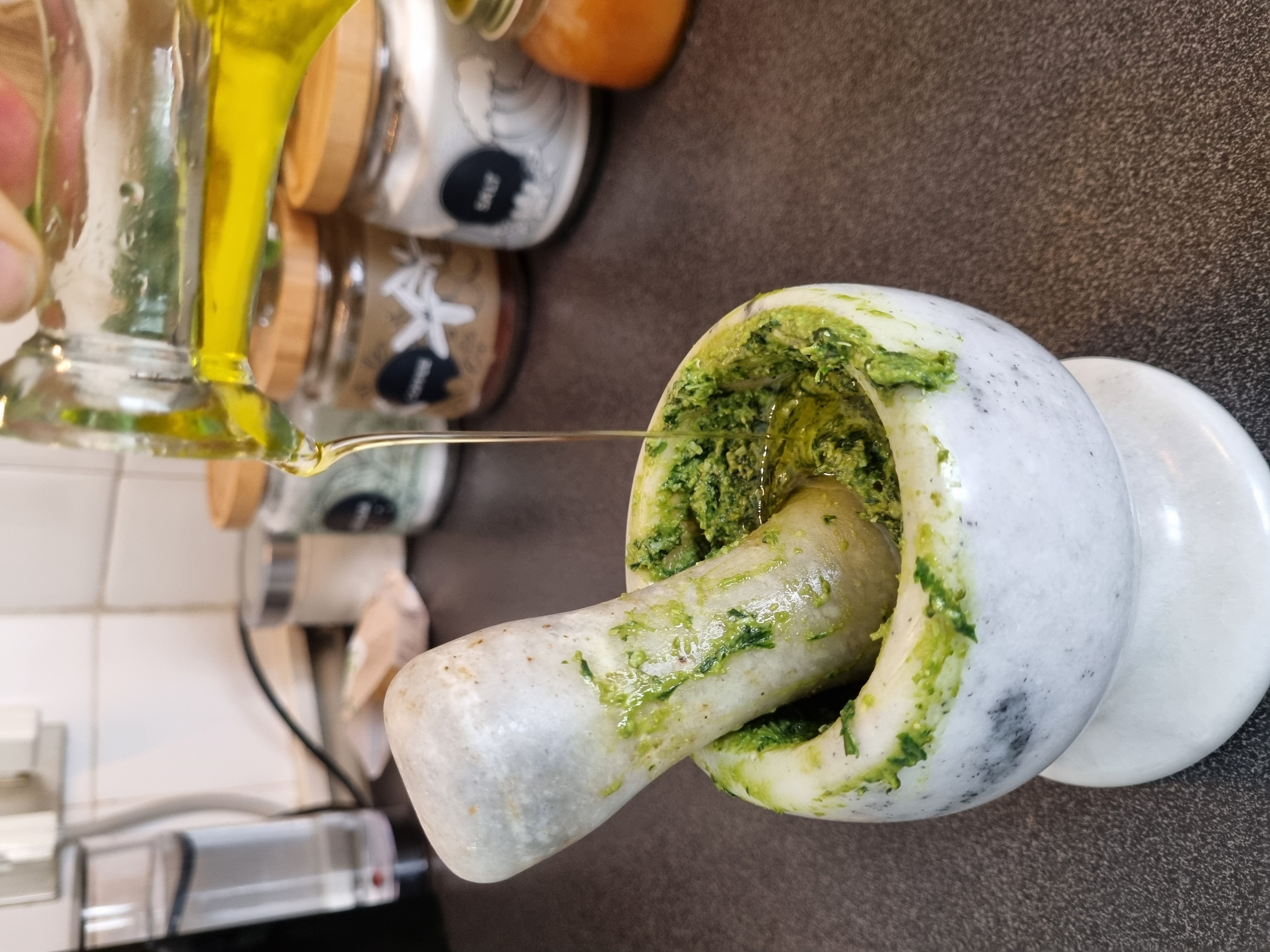 Detto ciò, possiamo prendere il mortaio e iniziare a pestare di brutto! (Ho il mortaio e il pestello in marmo, non in legno, chiedo venia ai genovesi!)