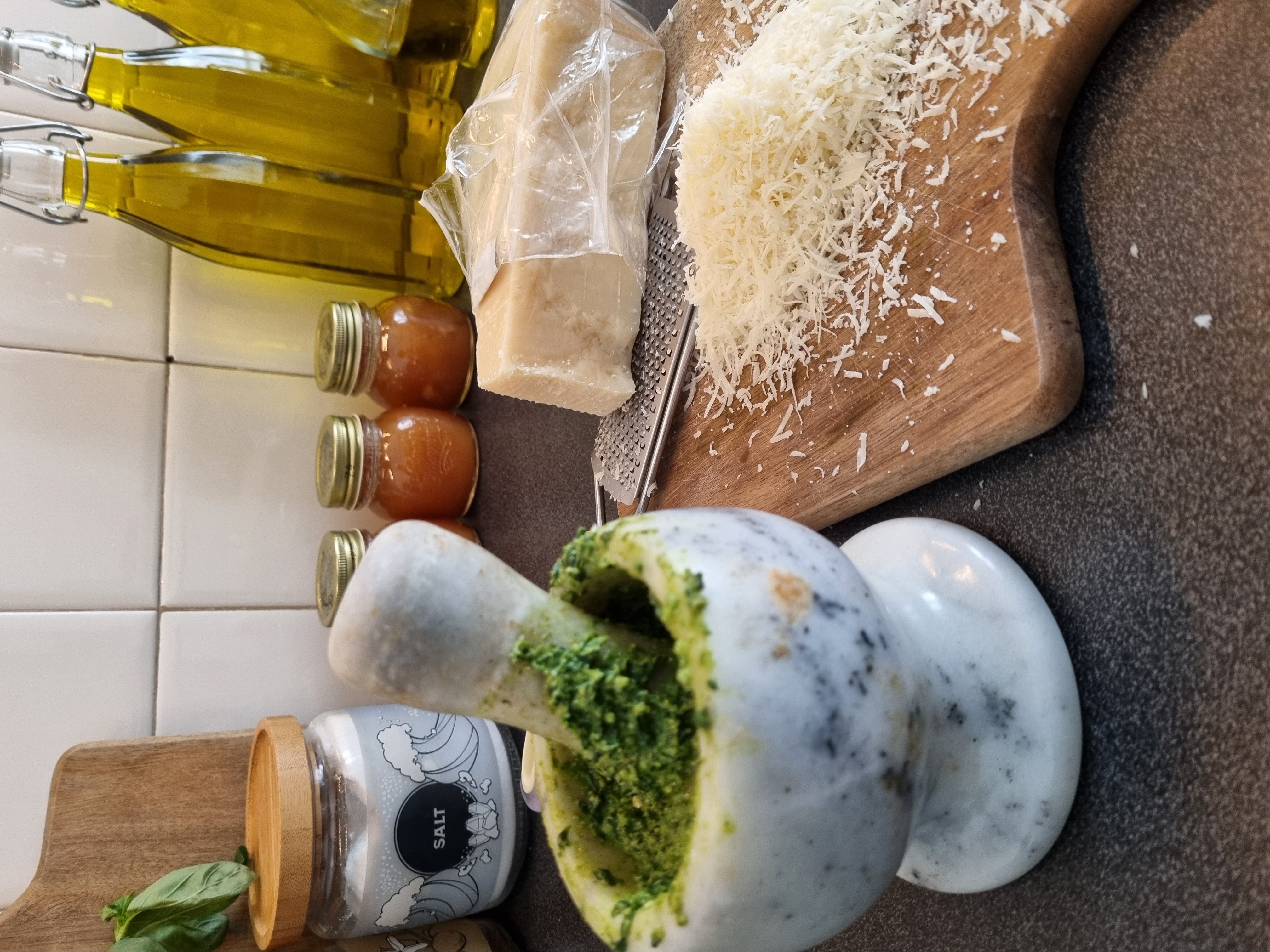 Pestiamoli insieme finché non prendono la consistenza di una crema, e poi aggiungiamo i pinoli.