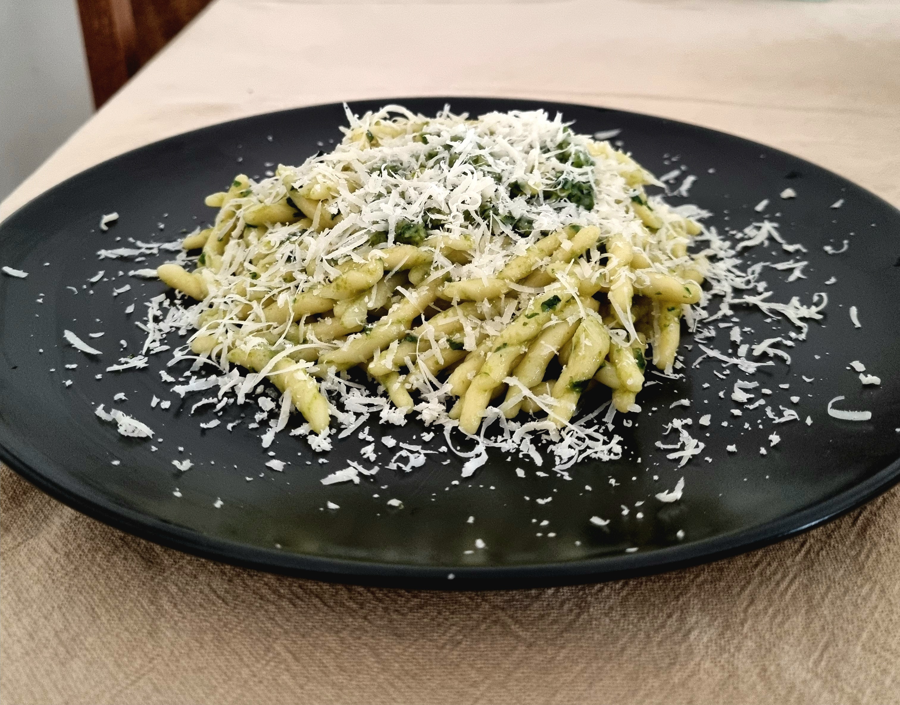 Il resto poi è molto semplice da fare. Aggiungiamo le trofie nell’acqua bollente precedentemente salata. Dopo 3/4 minuti le scoliamo. Aggiungiamo il pesto appena preparato, una grattugiata di parmigiano e…