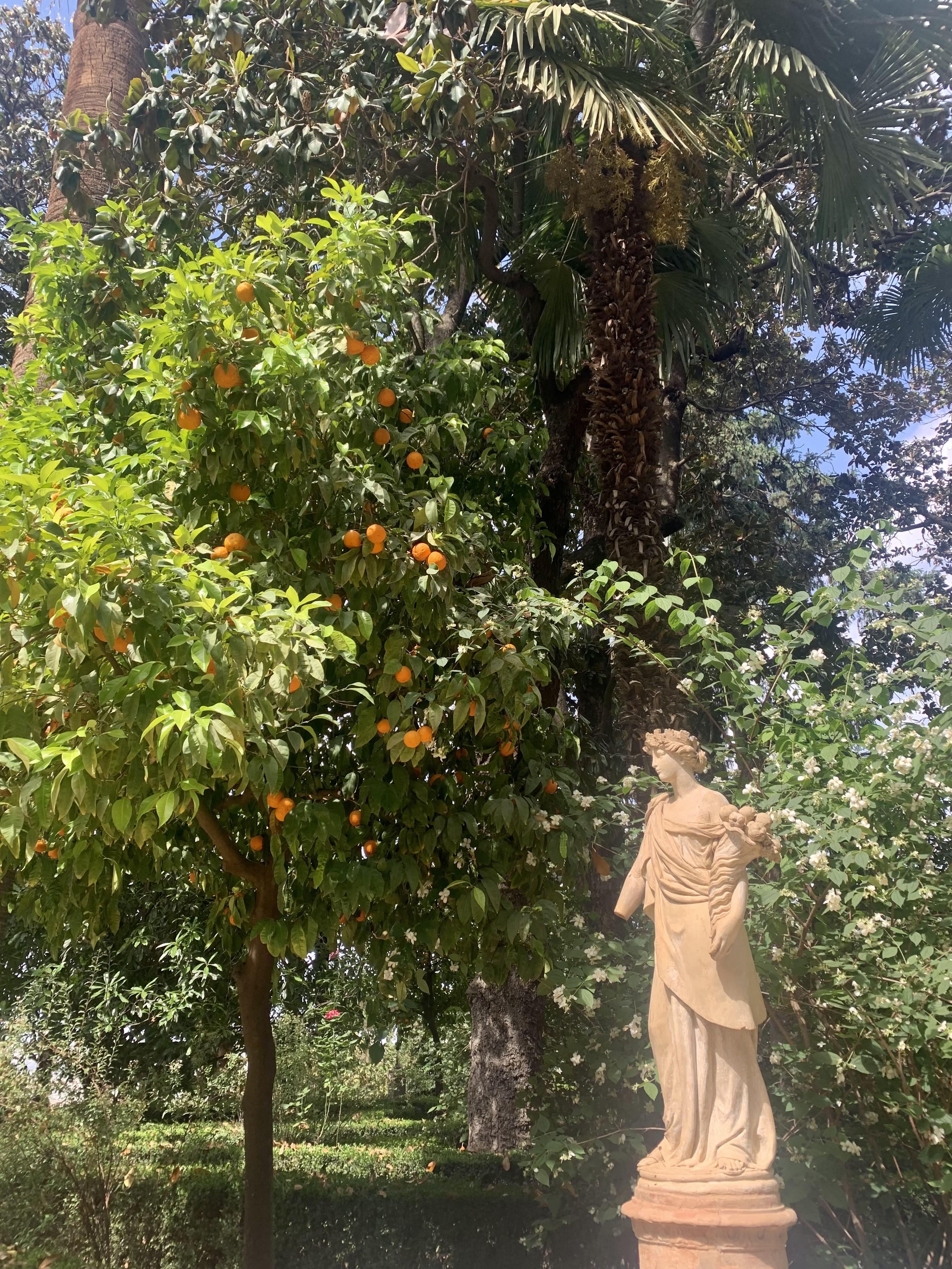 Quello della foto è un giardino con sole piante da frutta, nella zona centrale troviamo una fontana e intorno ad essa statue di vari déi dell’antichità.