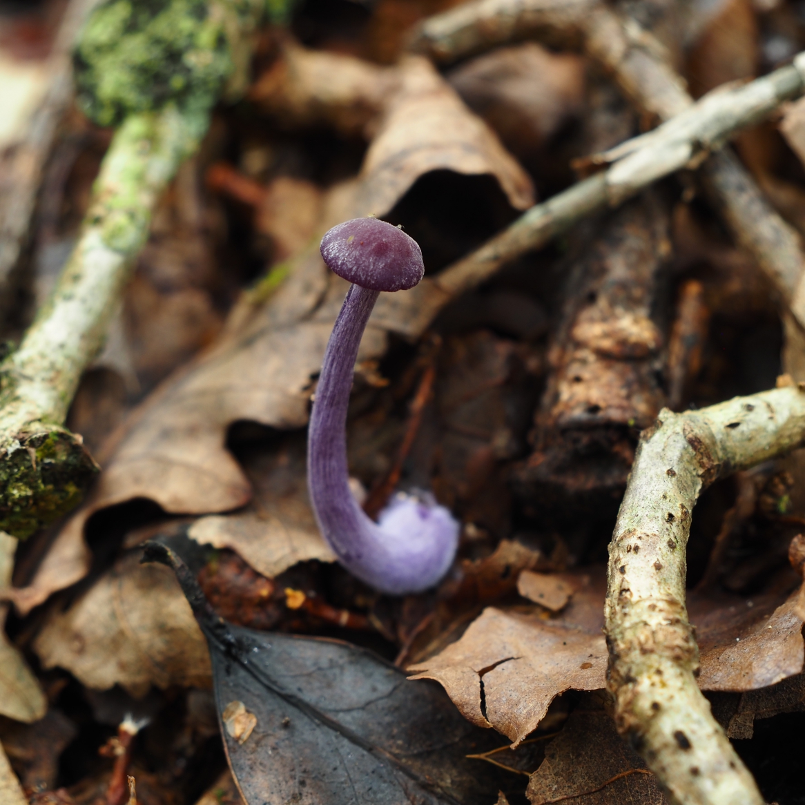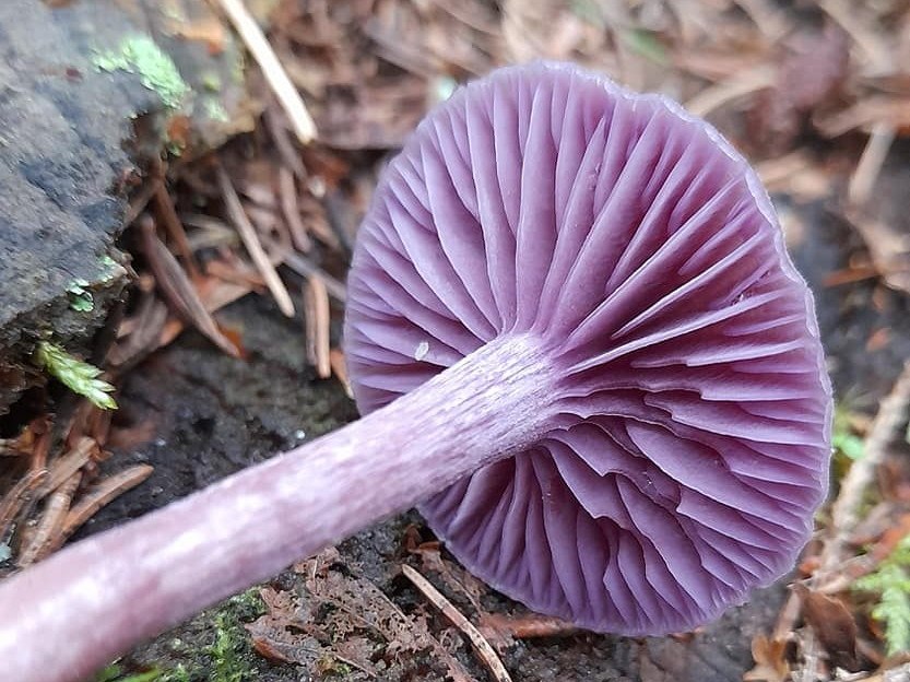 Warna: Jamur ini punya warna ungu/violet yang sangat mencolok (untuk jamur) sehingga terlihat seperti bukan bagian dari alam “biasa”.