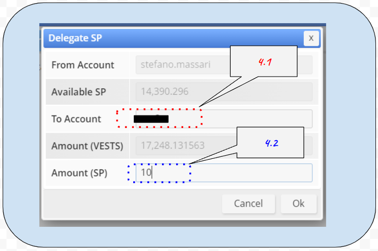 -4.1 Inserire il nome dell'account a cui vogliamo delegare STEEM (senza @)