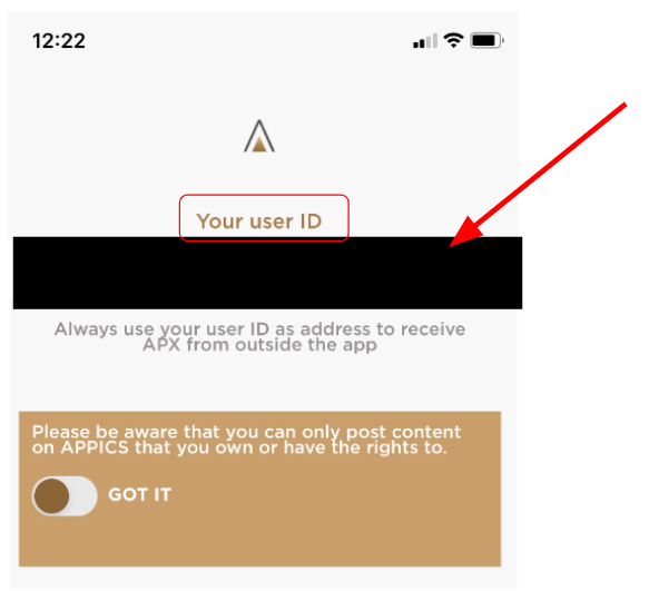 After that, you will be given a user ID which is also a wallet ID, this is very important. This series of numbers and letters correspond to the address you need to use to send APXs from outside the application.