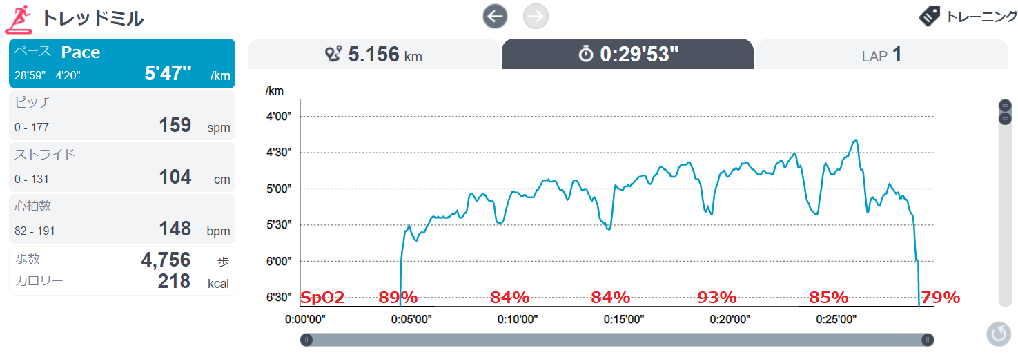 ワークアウトの最後に酸素飽和度が80%を下回りましたが、今回も30分間の推算走行距離は5kmに届きました。