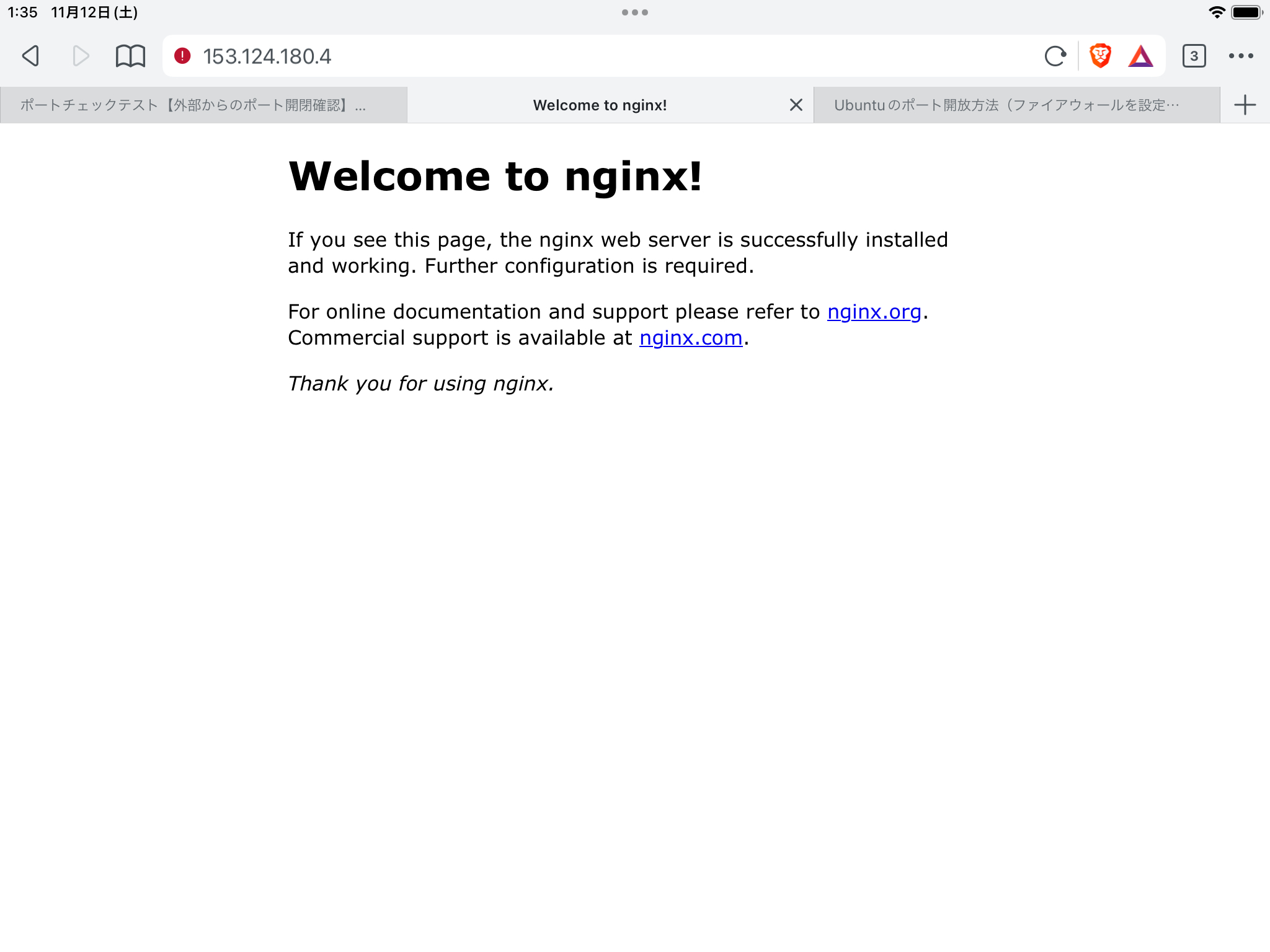 固定のIPアドレスが割り付けられ、ポート80がしっかり開いています。念の為スマホのテザリング経由でアクセスしたらホームページ開きました。