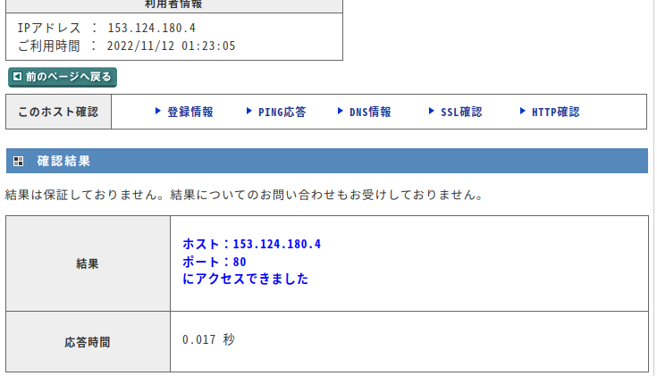 さて設定も終わりインターネットにアクセスし、IPアドレスやポートの状況を調べてみました。