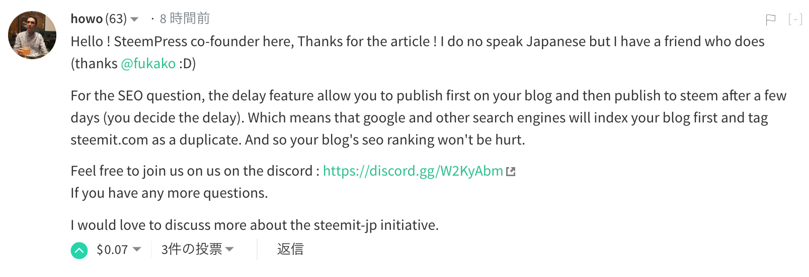 こうやってSteemPressのCo-founderから直接コメントいただけるところがSteemit面白いな感じさせるポイントですね!(コミュニティが活発だから早い早い)
